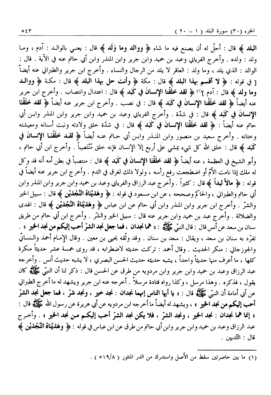 «إِنَّمَا هُمَا نَجْدَانِ: نَجْدُ الْخَيْرِ، وَنَجْدُ الشَّرِّ، فَلَا يَكُنْ نَجْدُ الشَّرِّ أَحَبَّ إِلَيْكُمْ مِنْ نَجْدِ الْخَيْرِ» . وَأَخْرَجَ عَبْدُ الرَّزَّاقِ وَعَبْدُ بْنُ حُمَيْدٍ وَابْنُ جَرِيرٍ وَابْنُ أَبِي حَاتِمٍ مِنْ طُرُقٍ عَنِ ابْنِ عَبَّاسٍ فِي قَوْلِهِ: وَهَدَيْناهُ النَّجْدَيْنِ قال: الثّديين.