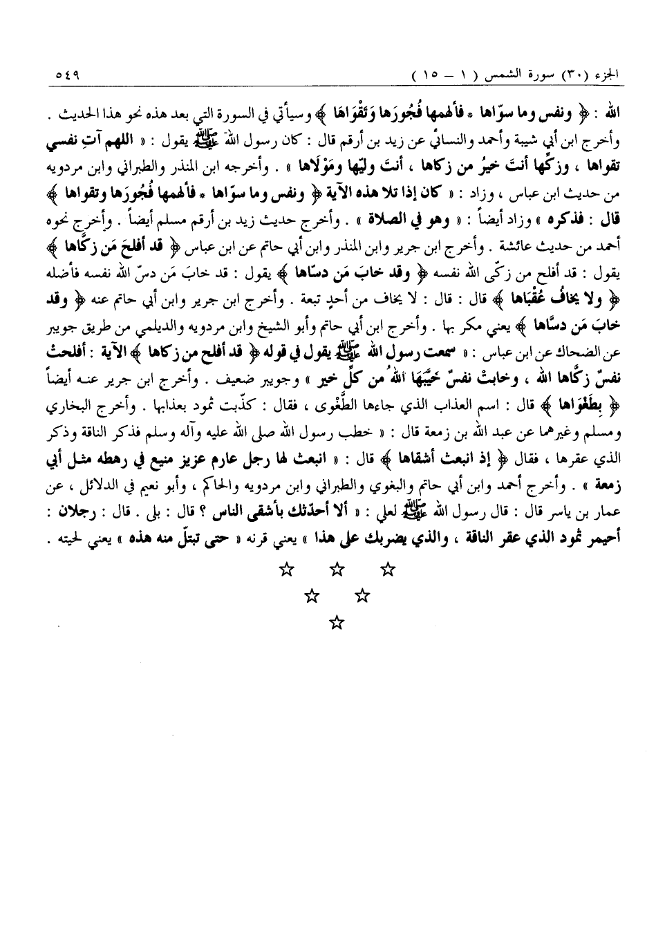 وَأَخْرَجَ ابْنُ أَبِي شَيْبَةَ وَأَحْمَدُ وَالنَّسَائِيُّ عَنْ زَيْدِ بْنِ أَرْقَمَ قَالَ: كَانَ رَسُولُ اللَّهِ صَلَّى اللَّهُ عَلَيْهِ وسلم يقول: «اللَّهُمَّ آتِ نَفْسِي تَقْوَاهَا، وَزَكِّهَا أَنْتَ خَيْرُ مَنْ زَكَّاهَا، أَنْتَ وَلِيُّهَا وَمَوْلَاهَا» . وَأَخْرَجَهُ ابْنُ الْمُنْذِرِ وَالطَّبَرَانِيُّ وَابْنُ مَرْدَوَيْهِ مِنْ حَدِيثِ ابْنِ عَبَّاسٍ، وَزَادَ: «كَانَ إِذَا تَلَا هَذِهِ الْآيَةَ وَنَفْسٍ وَما سَوَّاها- فَأَلْهَمَها فُجُورَها وَتَقْواها قَالَ: فَذَكَرَهُ» وَزَادَ أَيْضًا: «وَهُوَ فِي الصَّلَاةِ» . وَأَخْرَجَ حَدِيثَ زَيْدِ بْنِ أَرْقَمَ مُسْلِمٌ أَيْضًا. وَأَخْرَجَ نَحْوَهُ أَحْمَدُ مِنْ حَدِيثِ عَائِشَةَ. وَأَخْرَجَ ابْنُ جَرِيرٍ وَابْنُ الْمُنْذِرِ وَابْنُ أَبِي حاتم عن ابْنِ عَبَّاسٍ قَدْ أَفْلَحَ مَنْ زَكَّاها يَقُولُ: قَدْ أَفْلَحَ مَنْ زَكَّى اللَّهُ نَفْسَهُ وَقَدْ خابَ مَنْ دَسَّاها يَقُولُ: قَدْ خَابَ مَنْ دَسَّ اللَّهُ نَفْسَهُ فَأَضَلَّهُ وَلا يَخافُ عُقْباها قال: قَالَ: لَا يَخَافُ مِنْ أَحَدٍ تَبِعَةً. وَأَخْرَجَ ابْنُ جَرِيرٍ وَابْنُ أَبِي حَاتِمٍ عَنْهُ وَقَدْ خابَ مَنْ دَسَّاها يَعْنِي مَكَرَ بِهَا. وَأَخْرَجَ ابْنُ أَبِي حَاتِمٍ وَأَبُو الشَّيْخِ وَابْنُ مَرْدَوَيْهِ وَالدَّيْلَمِيُّ مِنْ طَرِيقِ جُوَيْبِرٍ عَنِ الضَّحَّاكِ عَنِ ابْنِ عَبَّاسٍ: «سَمِعَتْ رَسُولَ اللَّهِ صَلَّى اللَّهُ عَلَيْهِ وَسَلَّمَ يَقُولُ فِي قَوْلِهِ قَدْ أَفْلَحَ مَنْ زَكَّاها الْآيَةَ: أَفْلَحَتْ نَفْسٌ زَكَّاهَا اللَّهُ، وَخَابَتْ نَفْسٌ خَيَّبَهَا اللَّهُ مِنْ كُلِّ خَيْرٍ وَجُوَيْبِرٌ ضَعِيفٌ. وَأَخْرَجَ ابْنُ جَرِيرٍ عَنْهُ أَيْضًا بِطَغْواها قَالَ: اسْمُ الْعَذَابِ الَّذِي جَاءَهَا الطَّغْوَى، فَقَالَ: كَذَّبَتْ ثَمُودُ بِعَذَابِهَا. وَأَخْرَجَ الْبُخَارِيُّ وَمُسْلِمٌ وَغَيْرُهُمَا عَنْ عَبْدِ اللَّهِ بْنِ زَمْعَةَ قَالَ: «خطب رسول الله صلى الله عليه وآله وَسَلَّمَ فَذَكَرَ النَّاقَةَ وَذَكَرَ الَّذِي عَقَرَهَا، فَقَالَ إِذِ انْبَعَثَ أَشْقاها قَالَ: «انْبَعَثَ لَهَا رَجُلٌ عَارِمٌ عَزِيزٌ مَنِيعٌ فِي رَهْطِهِ مِثْلُ أَبِي زَمْعَةَ» . وَأَخْرَجَ أَحْمَدُ وَابْنُ أَبِي حَاتِمٍ وَالْبَغَوِيُّ وَالطَّبَرَانِيُّ وَابْنُ مَرْدَوَيْهِ وَالْحَاكِمُ، وَأَبُو نُعَيْمٍ فِي الدَّلَائِلِ، عَنْ عَمَّارِ بْنِ يَاسِرٍ قَالَ: قَالَ رَسُولُ اللَّهِ صَلَّى اللَّهُ عَلَيْهِ وَسَلَّمَ لِعَلِيٍّ: «أَلَا أُحَدِّثُكَ بِأَشْقَى النَّاسِ؟ قَالَ: بَلَى. قَالَ: رَجُلَانِ: