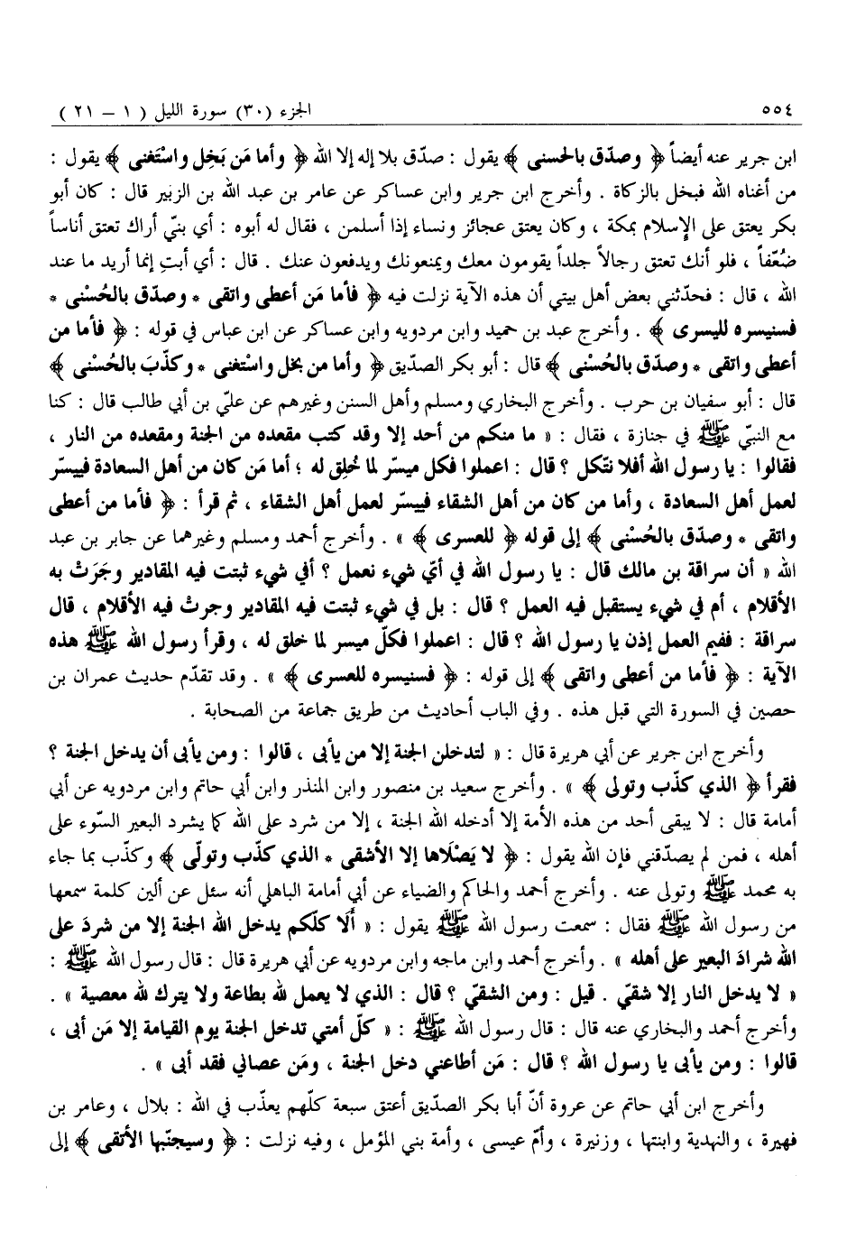 مَنْ أَغْنَاهُ اللَّهُ فَبَخِلَ بِالزَّكَاةِ. وَأَخْرَجَ ابْنُ جَرِيرٍ وَابْنُ عَسَاكِرَ عَنْ عَامِرِ بْنِ عَبْدِ اللَّهِ بْنِ الزُّبَيْرِ قَالَ: كَانَ أَبُو بَكْرٍ يَعْتِقُ عَلَى الْإِسْلَامِ بِمَكَّةَ، وَكَانَ يَعْتِقُ عَجَائِزَ وَنِسَاءً إِذَا أَسْلَمْنَ، فَقَالَ لَهُ أَبُوهُ: أَيْ بُنَيَّ أَرَاكَ تَعْتِقُ أُنَاسًا ضُعْفًا، فَلَوْ أَنَّكَ تَعْتِقُ رِجَالًا جُلُدًا يَقُومُونَ معك ويمنعونك وَيَدْفَعُونَ عَنْكَ. قَالَ: أَيْ أَبَتِ إِنَّمَا أُرِيدُ مَا عِنْدَ اللَّهِ، قَالَ: فَحَدَّثَنِي بَعْضُ أَهْلِ بَيْتِي أَنَّ هَذِهِ الْآيَةَ نَزَلَتْ فِيهِ فَأَمَّا مَنْ أَعْطى وَاتَّقى - وَصَدَّقَ بِالْحُسْنى - فَسَنُيَسِّرُهُ لِلْيُسْرى. وَأَخْرَجَ عَبْدُ بْنُ حُمَيْدٍ وَابْنُ مَرْدَوَيْهِ وَابْنُ عَسَاكِرَ عَنِ ابْنِ عَبَّاسٍ فِي قَوْلِهِ: فَأَمَّا مَنْ أَعْطى وَاتَّقى - وَصَدَّقَ بِالْحُسْنى قَالَ: أَبُو بَكْرٍ الصِّدِّيقُ وَأَمَّا مَنْ بَخِلَ وَاسْتَغْنى - وَكَذَّبَ بِالْحُسْنى قَالَ: أَبُو سُفْيَانَ بْنُ حَرْبٍ. وَأَخْرَجَ الْبُخَارِيُّ وَمُسْلِمٌ وَأَهْلُ السُّنَنِ وَغَيْرُهُمْ عَنِ عَلِيِّ بْنِ أَبِي طَالِبٍ قَالَ: كُنَّا مَعَ النَّبِيِّ صَلَّى اللَّهُ عَلَيْهِ وَسَلَّمَ فِي جِنَازَةٍ، فَقَالَ: «مَا مِنْكُمْ مِنْ أَحَدٍ إِلَّا وَقَدْ كُتِبَ مَقْعَدُهُ مِنَ الْجَنَّةِ وَمَقْعَدُهُ مِنَ النَّارِ، فَقَالُوا: يَا رَسُولَ اللَّهِ أَفَلَا نَتَّكِلُ؟ قَالَ: اعْمَلُوا فَكُلٌّ مُيَسَّرٌ لِمَا خُلِقَ لَهُ أَمَّا مَنْ كَانَ مِنْ أَهْلِ السَّعَادَةِ فَيُيَسَّرُ لِعَمَلِ أَهْلِ السَّعَادَةِ، وَأَمَّا مَنْ كَانَ مِنْ أَهْلِ الشَّقَاءِ فَيُيَسَّرُ لِعَمَلِ أَهْلِ الشَّقَاءِ، ثُمَّ قَرَأَ: فَأَمَّا مَنْ أَعْطى وَاتَّقى - وَصَدَّقَ بِالْحُسْنى إِلَى قَوْلِهِ لِلْعُسْرى» . وَأَخْرَجَ أَحْمَدُ وَمُسْلِمٌ وَغَيْرُهُمَا عَنْ جَابِرِ بْنِ عَبْدِ اللَّهِ «أَنَّ سُرَاقَةَ بْنَ مَالِكٍ قَالَ: يَا رَسُولَ اللَّهِ فِي أَيِّ شَيْءٍ نَعْمَلُ؟ أَفِي شَيْءٍ ثَبَتَتْ فِيهِ الْمَقَادِيرُ وَجَرَتْ بِهِ الْأَقْلَامُ، أَمْ فِي شَيْءٍ يُسْتَقْبَلُ فِيهِ العمل؟ قال: بل فِي شَيْءٍ ثَبَتَتْ فِيهِ الْمَقَادِيرُ وَجَرَتْ فِيهِ الْأَقْلَامُ، قَالَ سُرَاقَةُ: فَفِيمَ الْعَمَلُ إِذَنْ يَا رَسُولَ اللَّهِ؟ قَالَ: اعْمَلُوا فَكُلٌّ مُيَسَّرٌ لِمَا خُلِقَ لَهُ، وَقَرَأَ رَسُولُ اللَّهِ صَلَّى اللَّهُ عَلَيْهِ وَسَلَّمَ هَذِهِ الْآيَةَ: فَأَمَّا مَنْ أَعْطى وَاتَّقى إِلَى قَوْلِهِ: فَسَنُيَسِّرُهُ لِلْعُسْرى» . وَقَدْ تَقَدَّمَ حَدِيثُ عِمْرَانَ بْنِ حُصَيْنٍ فِي السُّورَةِ الَّتِي قَبْلَ هَذِهِ. وَفِي الْبَابِ أَحَادِيثُ مِنْ طَرِيقِ جَمَاعَةٍ مِنَ الصَّحَابَةِ.