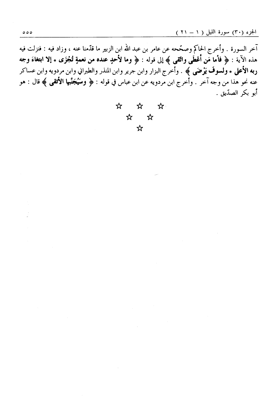 آخِرِ السُّورَةِ. وَأَخْرَجَ الْحَاكِمُ وَصَحَّحَهُ عَنْ عَامِرِ بن عبد الله ابن الزُّبَيْرِ مَا قَدَّمْنَا عَنْهُ، وَزَادَ فِيهِ: فَنَزَلَتْ فِيهِ هَذِهِ الْآيَةُ: فَأَمَّا مَنْ أَعْطى وَاتَّقى إِلَى قَوْلِهِ: وَما لِأَحَدٍ عِنْدَهُ مِنْ نِعْمَةٍ تُجْزى - إِلَّا ابْتِغاءَ وَجْهِ رَبِّهِ الْأَعْلى - وَلَسَوْفَ يَرْضى. وَأَخْرَجَ الْبَزَّارُ وَابْنُ جَرِيرٍ وَابْنُ الْمُنْذِرِ وَالطَّبَرَانِيُّ وَابْنُ مَرْدَوَيْهِ وَابْنُ عَسَاكِرَ عَنْهُ نَحْوَ هَذَا مِنْ وَجْهٍ آخَرَ. وَأَخْرَجَ ابْنُ مَرْدَوَيْهِ عَنِ ابْنِ عَبَّاسٍ فِي قَوْلِهِ: وَسَيُجَنَّبُهَا الْأَتْقَى قال: هو أبو بكر الصدّيق.