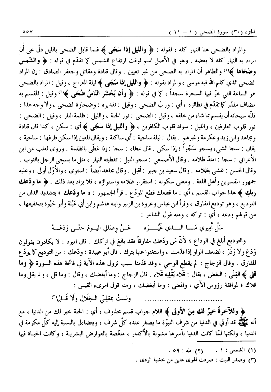 وَالْمُرَادُ بِالضُّحَى هُنَا النَّهَارُ كُلُّهُ، لِقَوْلِهِ: وَاللَّيْلِ إِذا سَجى فَلَمَّا قَابَلَ الضُّحَى بِاللَّيْلِ دَلَّ عَلَى أَنَّ الْمُرَادَ بِهِ النَّهَارُ كُلُّهُ لَا بَعْضُهُ. وَهُوَ فِي الْأَصْلِ اسْمٌ لِوَقْتِ ارْتِفَاعِ الشَّمْسِ كَمَا تَقَدَّمَ فِي قَوْلِهِ: وَالشَّمْسِ وَضُحاها «1» وَالظَّاهِرُ أَنَّ الْمُرَادَ بِهِ الضُّحَى مِنْ غَيْرِ تَعْيِينٍ. وَقَالَ قَتَادَةُ وَمُقَاتِلٌ وَجَعْفَرٌ الصَّادِقُ: إِنَّ المراد الضُّحَى الَّذِي كَلَّمَ اللَّهُ فِيهِ مُوسَى، وَالْمُرَادُ بِقَوْلِهِ: وَاللَّيْلِ إِذا سَجى لَيْلَةُ الْمِعْرَاجِ، وَقِيلَ: الْمُرَادُ بِالضُّحَى هُوَ السَّاعَةُ الَّتِي خَرَّ فِيهَا السَّحَرَةُ سُجَّدًا، كَمَا فِي قَوْلِهِ: وَأَنْ يُحْشَرَ النَّاسُ ضُحًى «2» وَقِيلَ: الْمُقْسَمُ بِهِ مُضَافٌ مُقَدَّرٌ كَمَا تَقَدَّمَ فِي نَظَائِرِهِ، أَيْ: وَرَبِّ الضُّحَى، وَقِيلَ: تَقْدِيرُهُ: وَضَحَاوَةِ الضُّحَى، وَلَا وَجْهَ لِهَذَا، فَلِلَّهِ سُبْحَانَهُ أَنْ يُقْسِمَ بِمَا شَاءَ مِنْ خَلْقِهِ، وَقِيلَ: الضُّحَى: نُورُ الْجَنَّةِ، وَاللَّيْلُ: ظُلْمَةُ النَّارِ، وَقِيلَ: الضُّحَى: