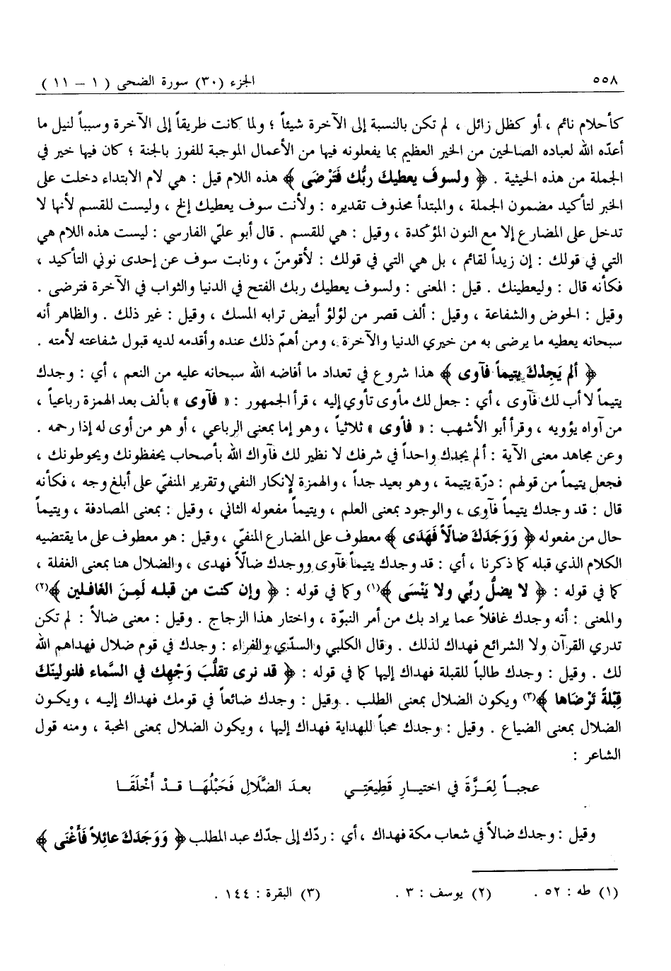 وَعَنْ مُجَاهِدٍ مَعْنَى الْآيَةِ: أَلَمْ يَجِدْكَ وَاحِدًا فِي شَرَفِكَ لَا نَظِيرَ لَكَ فَآوَاكَ اللَّهُ بِأَصْحَابٍ يَحْفَظُونَكَ وَيَحُوطُونَكَ، فَجَعَلَ يَتِيمًا مِنْ قَوْلِهِمْ: دُرَّةٌ يَتِيمَةٌ، وَهُوَ بِعِيدٌ جِدًّا، وَالْهَمْزَةُ لِإِنْكَارِ النَّفْيِ وَتَقْرِيرِ الْمَنْفِيِّ عَلَى أَبْلَغِ وَجْهٍ، فَكَأَنَّهُ قَالَ: قَدْ وَجَدَكَ يَتِيمًا فَآوَى، وَالْوُجُودُ بِمَعْنَى الْعِلْمِ، وَيَتِيمًا مَفْعُولُهُ الثَّانِي، وَقِيلَ: بِمَعْنَى الْمُصَادَفَةِ، وَيَتِيمًا حَالٌ مِنْ مَفْعُولِهِ وَوَجَدَكَ ضَالًّا فَهَدى مَعْطُوفٌ عَلَى الْمُضَارِعِ الْمَنْفِيِّ، وَقِيلَ: هُوَ مَعْطُوفٌ عَلَى مَا يَقْتَضِيهِ الْكَلَامُ الَّذِي قَبْلَهُ كَمَا ذَكَرْنَا، أَيْ: قَدْ وَجَدَكَ يَتِيمًا فَآوَى وَوَجَدَكَ ضَالًّا فَهَدَى، وَالضَّلَالُ هُنَا بِمَعْنَى الْغَفْلَةِ، كَمَا فِي قوله: لا يَضِلُّ رَبِّي وَلا يَنْسى «1» وَكَمَا فِي قَوْلِهِ: وَإِنْ كُنْتَ مِنْ قَبْلِهِ لَمِنَ الْغافِلِينَ «2» وَالْمَعْنَى: أَنَّهُ وَجَدَكَ غَافِلًا عَمَّا يُرَادُ بِكَ مِنْ أَمْرِ النُّبُوَّةِ، وَاخْتَارَ هَذَا الزَّجَّاجُ. وَقِيلَ: مَعْنَى ضَالًّا: لَمْ تَكُنْ تَدْرِي الْقُرْآنَ وَلَا الشَّرَائِعَ فَهَدَاكَ لِذَلِكَ. وَقَالَ الْكَلْبِيُّ وَالسُّدِّيُّ وَالْفَرَّاءُ: وَجَدَكَ فِي قَوْمِ ضَلَالٍ فَهَدَاهُمُ اللَّهُ لَكَ. وَقِيلَ: وَجَدَكَ طَالِبًا لِلْقِبْلَةِ فَهَدَاكَ إِلَيْهَا كَمَا فِي قَوْلِهِ: قَدْ نَرى تَقَلُّبَ وَجْهِكَ فِي السَّماءِ فَلَنُوَلِّيَنَّكَ قِبْلَةً تَرْضاها «3» وَيَكُونُ الضَّلَالُ بِمَعْنَى الطَّلَبِ. وَقِيلَ: وَجَدَكَ ضَائِعًا فِي قَوْمِكَ فَهَدَاكَ إِلَيْهِ، وَيَكُونُ الضَّلَالُ بِمَعْنَى الضَّيَاعِ. وَقِيلَ: وَجَدَكَ مُحِبًّا لِلْهِدَايَةِ فَهَدَاكَ إِلَيْهَا، وَيَكُونُ الضَّلَالُ بِمَعْنَى الْمَحَبَّةِ، وَمِنْهُ قَوْلُ الشَّاعِرِ: