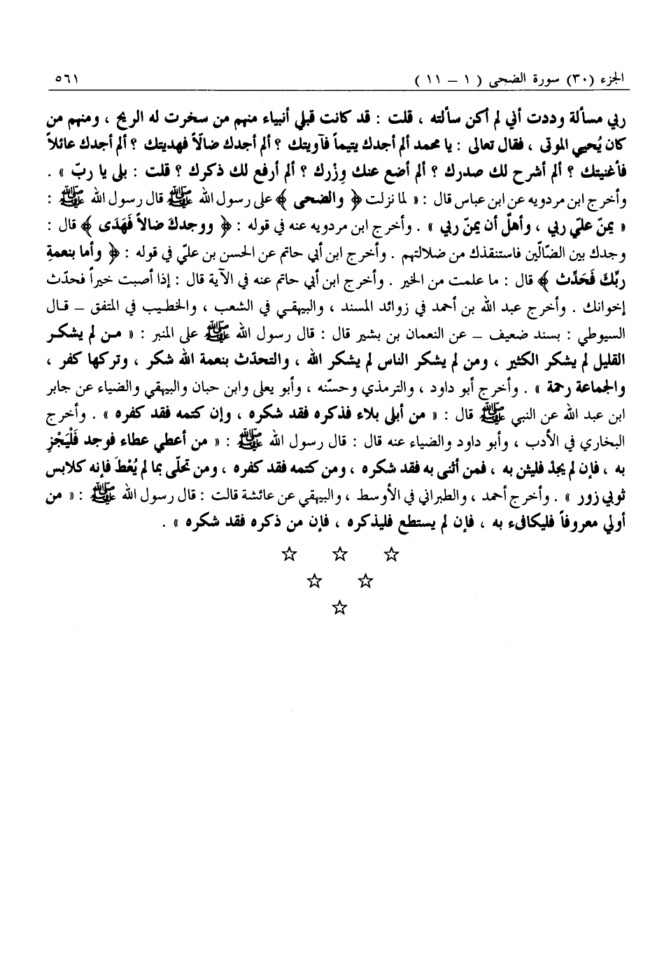 وَجَدَكَ بَيْنَ الضَّالِّينَ فَاسْتَنْقَذَكَ مِنْ ضَلَالَتِهِمْ. وَأَخْرَجَ ابْنُ أَبِي حَاتِمٍ عَنِ الْحَسَنِ بْنِ عَلِيٍّ فِي قَوْلِهِ: وَأَمَّا بِنِعْمَةِ رَبِّكَ فَحَدِّثْ قَالَ: مَا عَلِمْتَ مِنَ الْخَيْرِ. وَأَخْرَجَ ابْنُ أَبِي حَاتِمٍ عَنْهُ فِي الْآيَةِ قَالَ: إِذَا أَصَبْتَ خَيْرًا فَحَدِّثْ إِخْوَانَكَ. وَأَخْرَجَ عَبْدُ اللَّهِ بْنُ أَحْمَدَ فِي زَوَائِدِ الْمُسْنَدِ، وَالْبَيْهَقِيُّ فِي الشُّعَبِ، وَالْخَطِيبُ فِي الْمُتَّفَقِ- قَالَ السُّيُوطِيُّ: بِسَنَدٍ ضَعِيفٍ- عَنِ النُّعْمَانِ بْنِ بَشِيرٍ قَالَ: قَالَ رَسُولُ اللَّهِ صَلَّى اللَّهُ عَلَيْهِ وَسَلَّمَ عَلَى الْمِنْبَرِ: «مَنْ لَمْ يَشْكُرِ الْقَلِيلَ لَمْ يَشْكُرِ الْكَثِيرَ، وَمَنْ لَمْ يَشْكُرِ النَّاسَ لَمْ يَشْكُرِ اللَّهَ، وَالتَّحَدُّثُ بِنِعْمَةِ اللَّهِ شُكْرٌ، وَتَرْكُهَا كُفْرٌ، وَالْجَمَاعَةُ رَحْمَةٌ» . وَأَخْرَجَ أَبُو داود، والترمذي وحسّنه، وأبو يَعْلَى وَابْنُ حِبَّانَ وَالْبَيْهَقِيُّ وَالضِّيَاءُ عَنْ جَابِرِ ابن عَبْدِ اللَّهِ عَنِ النَّبِيِّ صَلَّى اللَّهُ عَلَيْهِ وَسَلَّمَ قَالَ: «مَنْ أَبْلَى بَلَاءً فَذَكَرَهُ فَقَدْ شَكَرَهُ، وَإِنْ كَتَمَهُ فَقَدْ كَفَرَهُ» . وَأَخْرَجَ الْبُخَارِيُّ فِي الْأَدَبِ، وَأَبُو دَاوُدَ وَالضِّيَاءُ عَنْهُ قَالَ: قَالَ رَسُولُ اللَّهِ صَلَّى اللَّهُ عَلَيْهِ وَسَلَّمَ: «مَنْ أُعْطِيَ عَطَاءً فَوَجَدَ فَلْيَجُزْ بِهِ، فَإِنْ لَمْ يَجِدْ فَلْيُثْنِ بِهِ، فَمَنْ أَثْنَى بِهِ فَقَدْ شَكَرَهُ، وَمَنْ كَتَمَهُ فَقَدْ كَفَرَهُ، وَمَنْ تَحَلَّى بِمَا لَمْ يُعْطَ فَإِنَّهُ كَلَابِسِ ثَوْبَيْ زُورٍ» . وَأَخْرَجَ أَحْمَدُ، وَالطَّبَرَانِيُّ فِي الْأَوْسَطِ، وَالْبَيْهَقِيُّ عَنْ عَائِشَةَ قَالَتْ: قَالَ رَسُولُ اللَّهِ صَلَّى اللَّهُ عَلَيْهِ وَسَلَّمَ: «مَنْ أُولِيَ مَعْرُوفًا فَلْيُكَافِئْ بِهِ، فَإِنْ لَمْ يَسْتَطِعْ فَلْيَذْكُرْهُ، فَإِنَّ مَنْ ذكره فقد شكره» .