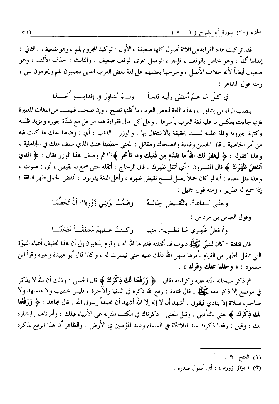 بِنَصْبِ الرَّاءِ مِنْ يُشَاوِرُ، وَهَذِهِ اللُّغَةُ لِبَعْضِ الْعَرَبِ مَا أَظُنُّهَا تَصِحُّ، وَإِنْ صَحَّتْ فَلَيْسَتْ مِنَ اللُّغَاتِ الْمُعْتَبَرَةِ فَإِنَّهَا جَاءَتْ بِعَكْسِ مَا عَلَيْهِ لُغَةُ الْعَرَبِ بِأَسْرِهَا. وَعَلَى كُلِّ حَالٍ فَقِرَاءَةُ هَذَا الرَّجُلِ مَعَ شِدَّةِ جَوْرِهِ وَمَزِيدِ ظُلْمِهِ وَكَثْرَةِ جَبَرُوتِهِ وَقِلَّةِ عِلْمِهِ لَيْسَتْ بِحَقِيقَةٍ بِالِاشْتِغَالِ بِهَا. وَالْوِزْرُ: الذَّنْبُ، أَيْ: وَضَعْنَا عَنْكَ مَا كُنْتَ فِيهِ مِنْ أَمْرِ الْجَاهِلِيَّةِ. قَالَ الْحَسَنُ وَقَتَادَةُ وَالضَّحَّاكُ وَمُقَاتِلٌ: الْمَعْنَى حَطَطْنَا عَنْكَ الَّذِي سَلَفَ مِنْكَ فِي الْجَاهِلِيَّةِ، وَهَذَا كَقَوْلِهِ: لِيَغْفِرَ لَكَ اللَّهُ مَا تَقَدَّمَ مِنْ ذَنْبِكَ وَما تَأَخَّرَ «1» ثم وصف هذا الوزر فقال: الَّذِي أَنْقَضَ ظَهْرَكَ قَالَ الْمُفَسِّرُونَ: أَيْ أَثْقَلَ ظَهْرَكَ. قَالَ الزَّجَّاجُ: أَثْقَلَهُ حَتَّى سُمِعَ لَهُ نَقِيضٌ، أَيْ: صَوْتٌ، وَهَذَا مِثْلُ مَعْنَاهُ: أَنَّهُ لَوْ كَانَ حَمْلًا يُحْمَلُ لَسُمِعَ نَقِيضُ ظَهْرِهِ، وَأَهْلُ اللُّغَةِ يَقُولُونَ: أَنْقَضَ الْحَمْلُ ظَهْرَ النَّاقَةِ إِذَا سُمِعَ لَهُ صَرِيرٌ، وَمِنْهُ قَوْلُ جَمِيلٍ: