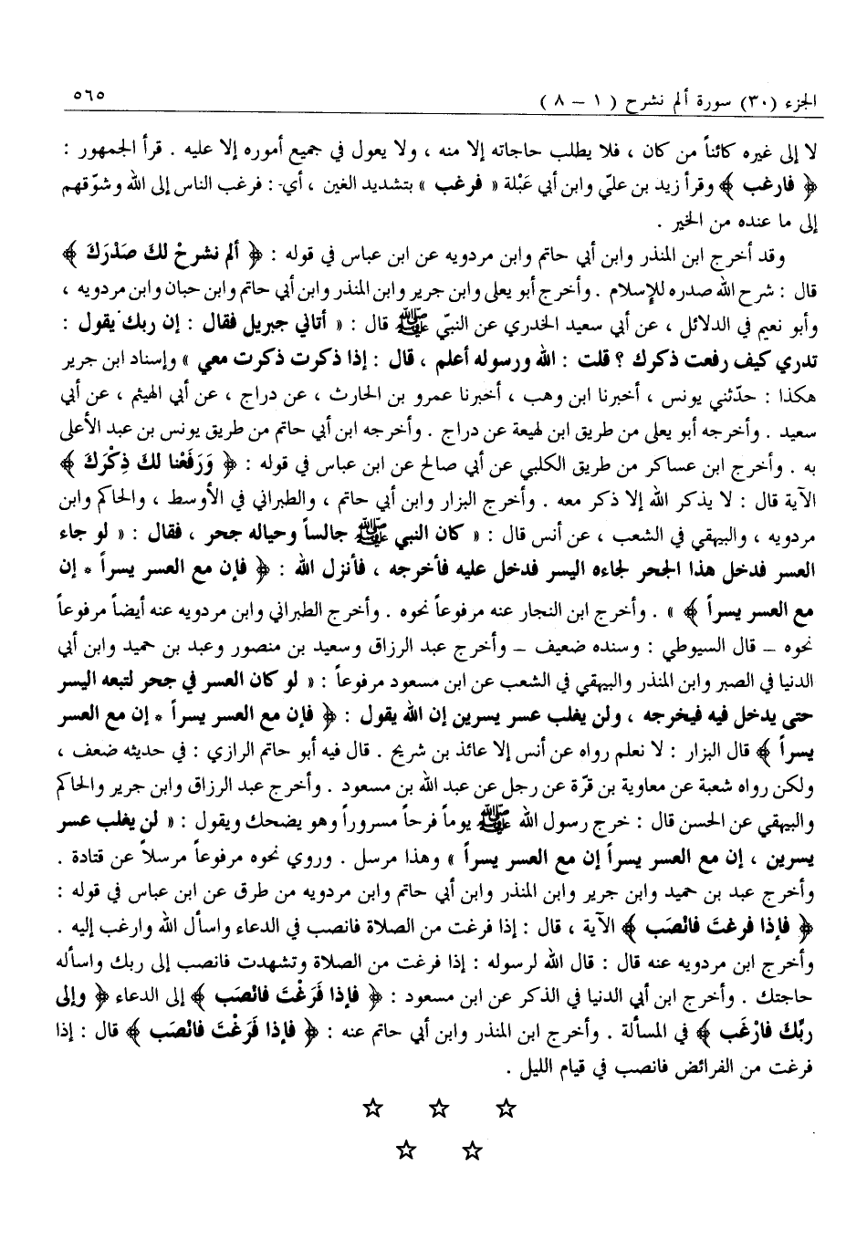 تَدْرِي كَيْفَ رَفَعْتَ ذِكْرَكَ؟ قُلْتُ: اللَّهُ وَرَسُولُهُ أَعْلَمُ، قَالَ: إِذَا ذُكْرِتُ ذُكِرْتَ مَعِيَ» وَإِسْنَادُ ابْنِ جَرِيرٍ هَكَذَا: حَدَّثَنِي يُونُسُ، أَخْبَرَنَا ابْنُ وَهْبٍ، أَخْبَرَنَا عَمْرُو بْنُ الْحَارِثِ، عَنْ دَرَّاجٍ، عَنْ أَبِي الْهَيْثَمِ، عَنْ أَبِي سَعِيدٍ. وَأَخْرَجَهُ أَبُو يَعْلَى مِنْ طَرِيقِ ابْنِ لَهِيعَةَ عَنْ دَرَّاجٍ. وَأَخْرَجَهُ ابْنُ أَبِي حَاتِمٍ مِنْ طَرِيقِ يُونُسَ بْنِ عَبْدِ الْأَعْلَى بِهِ. وَأَخْرَجَ ابْنُ عَسَاكِرَ مِنْ طَرِيقِ الْكَلْبِيِّ عَنْ أَبِي صَالِحٍ عَنِ ابْنِ عَبَّاسٍ فِي قَوْلِهِ: وَرَفَعْنا لَكَ ذِكْرَكَ الْآيَةَ قَالَ: لَا يُذْكَرُ اللَّهُ إِلَّا ذُكِرَ مَعَهُ. وَأَخْرَجَ الْبَزَّارُ وَابْنُ أَبِي حَاتِمٍ، وَالطَّبَرَانِيُّ فِي الْأَوْسَطِ، وَالْحَاكِمُ وَابْنُ مَرْدَوَيْهِ، وَالْبَيْهَقِيُّ فِي الشُّعَبِ، عَنْ أَنَسٍ قَالَ: «كَانَ النَّبِيُّ صَلَّى اللَّهُ عَلَيْهِ وَسَلَّمَ جَالِسًا وحياله جحر، فقال: «لو جاء العسر فدخل هذا الجحر لجاءه اليسر فدخل عليه فأخرجه، فَأَنْزَلَ اللَّهُ: فَإِنَّ مَعَ الْعُسْرِ يُسْراً- إِنَّ مَعَ الْعُسْرِ يُسْراً» . وَأَخْرَجَ ابْنُ النَّجَّارِ عَنْهُ مَرْفُوعًا نَحْوَهُ. وَأَخْرَجَ الطَّبَرَانِيُّ وَابْنُ مَرْدَوَيْهِ عَنْهُ أَيْضًا مَرْفُوعًا نَحْوَهُ- قَالَ السُّيُوطِيُّ: وَسَنَدُهُ ضَعِيفٌ- وَأَخْرَجَ عَبْدُ الرَّزَّاقِ وَسَعِيدُ بْنُ مَنْصُورٍ وَعَبْدُ بْنُ حُمَيْدٍ وَابْنُ أَبِي الدُّنْيَا فِي الصَّبْرِ وَابْنُ الْمُنْذِرِ وَالْبَيْهَقِيُّ فِي الشُّعَبِ عَنِ ابْنِ مَسْعُودٍ مَرْفُوعًا: «لَوْ كَانَ الْعُسْرُ فِي جُحْرٍ لَتَبِعَهُ الْيُسْرُ حَتَّى يَدْخُلَ فِيهِ فَيُخْرِجَهُ، وَلَنْ يَغْلِبَ عُسْرٌ يُسْرَيْنِ إِنَّ اللَّهَ يَقُولُ: فَإِنَّ مَعَ الْعُسْرِ يُسْراً- إِنَّ مَعَ الْعُسْرِ يُسْراً قَالَ الْبَزَّارُ: لَا نَعْلَمُ رَوَاهُ عَنْ أَنَسٍ إِلَّا عَائِذُ بْنُ شُرَيْحٍ. قَالَ فِيهِ أَبُو حَاتِمٍ الرَّازِيُّ: فِي حَدِيثِهِ ضَعْفٌ، وَلَكِنْ رَوَاهُ شُعْبَةُ عَنْ مُعَاوِيَةَ بْنِ قُرَّةَ عَنْ رَجُلٍ عَنْ عَبْدِ اللَّهِ بْنِ مَسْعُودٍ. وَأَخْرَجَ عَبْدُ الرَّزَّاقِ وَابْنُ جَرِيرٍ وَالْحَاكِمُ وَالْبَيْهَقِيُّ عَنِ الْحَسَنِ قَالَ: خَرَجَ رَسُولُ اللَّهِ صَلَّى اللَّهُ عَلَيْهِ وَسَلَّمَ يَوْمًا فَرِحًا مَسْرُورًا وَهُوَ يَضْحَكُ وَيَقُولُ: «لَنْ يَغْلِبَ عُسْرٌ يُسْرَيْنِ، إِنَّ مَعَ الْعُسْرِ يُسْرًا إِنَّ مَعَ الْعُسْرِ يُسْرًا» وَهَذَا مُرْسَلٌ. وَرُوِيَ نَحْوَهُ مَرْفُوعًا مُرْسَلًا عَنْ قَتَادَةَ.