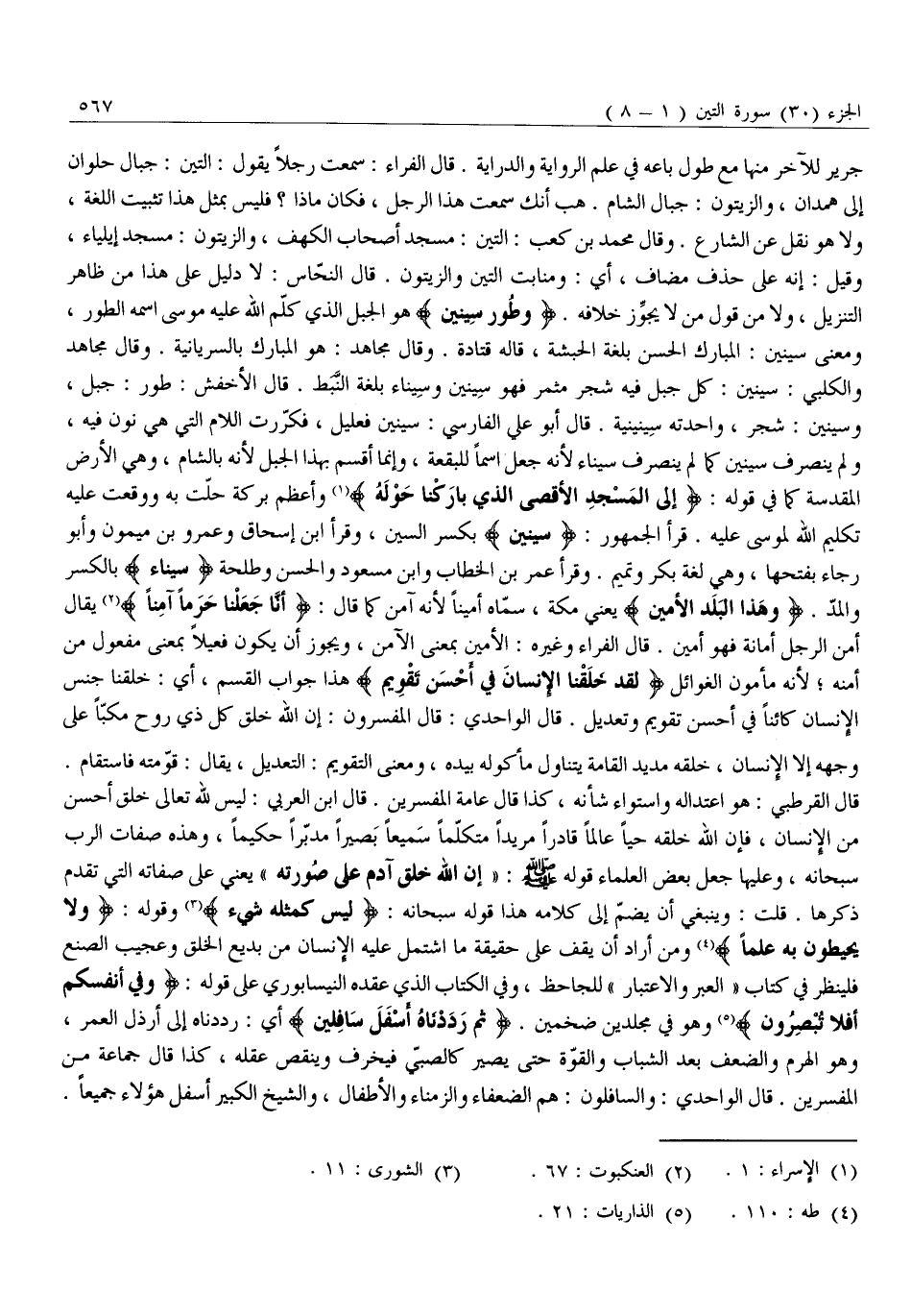 جَرِيرٍ لِلْآخَرِ مِنْهَا مَعَ طُولِ بَاعِهِ فِي عِلْمِ الرِّوَايَةِ وَالدِّرَايَةِ. قَالَ الْفَرَّاءُ: سَمِعْتُ رَجُلًا يَقُولُ: التِّينُ: جِبَالُ حُلْوَانَ إِلَى هَمْدَانَ، وَالزَّيْتُونُ: جبال الشام. هَبْ أَنَّكَ سَمِعْتَ هَذَا الرَّجُلَ، فَكَانَ مَاذَا؟ فليس بمثل هذا تثبيت اللُّغَةُ، وَلَا هُوَ نَقْلٌ عَنِ الشَّارِعِ. وَقَالَ مُحَمَّدُ بْنُ كَعْبٍ: التِّينُ: مَسْجِدُ أَصْحَابِ الْكَهْفِ، وَالزَّيْتُونُ: مَسْجِدُ إِيلِيَاءَ، وَقِيلَ: إِنَّهُ عَلَى حَذْفِ مُضَافٍ، أَيْ: وَمَنَابِتِ التِّينِ وَالزَّيْتُونِ. قَالَ النَّحَّاسُ: لَا دَلِيلَ عَلَى هَذَا مِنْ ظَاهِرِ التَّنْزِيلِ، وَلَا مِنْ قَوْلِ مَنْ لَا يَجُوزُ خِلَافُهُ. وَطُورِ سِينِينَ هُوَ الْجَبَلُ الَّذِي كَلَّمَ اللَّهُ عَلَيْهِ مُوسَى اسمه الطور، ومعنى سينين: الْمُبَارَكُ الْحَسَنُ بِلُغَةِ الْحَبَشَةِ، قَالَهُ قَتَادَةُ. وَقَالَ مُجَاهِدٌ: هُوَ الْمُبَارَكُ بِالسُّرْيَانِيَّةِ. وَقَالَ مُجَاهِدٌ وَالْكَلْبِيُّ: سِينِينَ: كُلُّ جَبَلٍ فِيهِ شَجَرٌ مُثْمِرٌ فَهُوَ سينين وسيناء بلغة النّبط. قال الأخفش: طور: جبل، وسينين: شجر، واحدته سينينية. قال أبو علي الفارسي: سينين فعليل، فكرّرت اللام التي هي نون فيه، ولم ينصرف سينين كما لم ينصرف سيناء لِأَنَّهُ جُعِلَ اسْمًا لِلْبُقْعَةِ، وَإِنَّمَا أَقْسَمَ بِهَذَا الْجَبَلِ لِأَنَّهُ بِالشَّامِ، وَهِيَ الْأَرْضُ الْمُقَدَّسَةُ كَمَا فِي قَوْلِهِ: إِلَى الْمَسْجِدِ الْأَقْصَى الَّذِي بارَكْنا حَوْلَهُ «1» وَأَعْظَمُ بَرَكَةٍ حَلَّتْ بِهِ وَوَقَعَتْ عَلَيْهِ تَكْلِيمُ اللَّهِ لِمُوسَى عَلَيْهِ. قَرَأَ الْجُمْهُورُ: سِينِينَ بِكَسْرِ السِّينِ، وَقَرَأَ ابْنُ إِسْحَاقَ وَعَمْرُو بْنُ مَيْمُونٍ وَأَبُو رَجَاءٍ بِفَتْحِهَا، وَهِيَ لُغَةُ بَكْرٍ وَتَمِيمٍ. وَقَرَأَ عُمَرُ بْنُ الْخَطَّابِ وَابْنُ مَسْعُودٍ وَالْحَسَنُ وَطَلْحَةُ سَيْناءَ بِالْكَسْرِ وَالْمَدِّ. وَهذَا الْبَلَدِ الْأَمِينِ يَعْنِي مَكَّةَ، سَمَّاهُ أَمِينًا لِأَنَّهُ آمَنَ كَمَا قال: أَنَّا جَعَلْنا حَرَماً آمِناً «2» يُقَالُ أَمِنَ الرَّجُلُ أَمَانَةً فَهُوَ أَمِينٌ. قَالَ الْفَرَّاءُ وَغَيْرُهُ: الْأَمِينُ بِمَعْنَى الْآمِنِ، وَيَجُوزُ أَنْ يَكُونَ فَعِيلًا بِمَعْنَى مَفْعُولٍ مِنْ أَمِنَهُ لِأَنَّهُ مَأْمُونُ الْغَوَائِلِ لَقَدْ خَلَقْنَا الْإِنْسانَ فِي أَحْسَنِ تَقْوِيمٍ هَذَا جَوَابُ الْقَسَمِ، أَيْ: خَلَقْنَا جِنْسَ الْإِنْسَانِ كَائِنًا فِي أَحْسَنِ تَقْوِيمٍ وَتَعْدِيلٍ. قَالَ الْوَاحِدِيُّ: قَالَ الْمُفَسِّرُونَ: إِنَّ اللَّهَ خَلَقَ كُلَّ ذِي رُوحٍ مُكِبًّا عَلَى وَجْهِهِ إِلَّا الْإِنْسَانَ، خَلَقَهُ مَدِيدَ الْقَامَةِ يَتَنَاوَلُ مَأْكُولَهُ بِيَدِهِ، وَمَعْنَى التَّقْوِيمِ: التَّعْدِيلُ، يُقَالُ: قَوَّمْتُهُ فَاسْتَقَامَ.