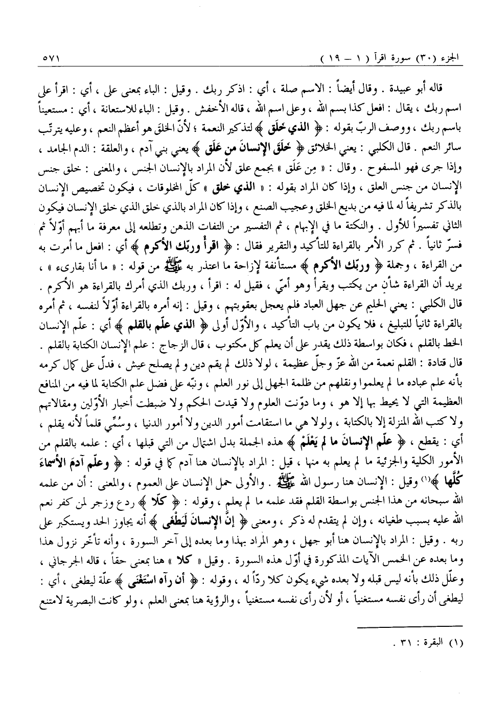 قَالَهُ أَبُو عُبَيْدَةَ. وَقَالَ أَيْضًا: الِاسْمُ صِلَةٌ، أَيْ: اذْكُرْ رَبَّكَ. وَقِيلَ: الْبَاءُ بِمَعْنَى عَلَى، أَيِ: اقْرَأْ عَلَى اسْمِ رَبِّكَ، يُقَالُ: افْعَلْ كَذَا بِسْمِ اللَّهِ، وَعَلَى اسْمِ اللَّهِ، قَالَهُ الْأَخْفَشُ. وَقِيلَ: الْبَاءُ لِلِاسْتِعَانَةِ، أَيْ: مُسْتَعِينًا بَاسِمِ رَبِّكَ، وَوَصَفَ الرَّبَّ بِقَوْلِهِ: الَّذِي خَلَقَ لِتَذْكِيرِ النِّعْمَةِ لِأَنَّ الْخَلْقَ هُوَ أَعْظَمُ النِّعَمِ، وَعَلَيْهِ يَتَرَتَّبُ سَائِرُ النِّعَمِ. قَالَ الْكَلْبِيُّ: يَعْنِي الْخَلَائِقَ خَلَقَ الْإِنْسانَ مِنْ عَلَقٍ يَعْنِي بَنِي آدَمَ، وَالْعَلَقَةُ: الدَّمُ الْجَامِدُ، وَإِذَا جَرَى فَهُوَ الْمَسْفُوحُ. وَقَالَ: «مِنْ عَلَقٍ» بِجَمْعِ عَلَقٍ لِأَنَّ الْمُرَادَ بِالْإِنْسَانِ الْجِنْسُ، وَالْمَعْنَى: خَلَقَ جِنْسَ الْإِنْسَانِ مِنْ جِنْسِ الْعَلَقِ، وَإِذَا كَانَ الْمُرَادُ بِقَوْلِهِ: «الَّذِي خَلَقَ» كُلَّ الْمَخْلُوقَاتِ، فَيَكُونُ تَخْصِيصُ الْإِنْسَانِ بِالذِّكْرِ تَشْرِيفًا لَهُ لِمَا فِيهِ مِنْ بَدِيعِ الْخَلْقِ وعجيب الصنع، وإذا كان المراد بالذي خَلَقَ الَّذِي خَلَقَ الْإِنْسَانَ فَيَكُونُ الثَّانِي تَفْسِيرًا لِلْأَوَّلِ. وَالنُّكْتَةُ مَا فِي الْإِبْهَامِ، ثُمَّ التَّفْسِيرُ مِنِ الْتِفَاتِ الذِّهْنِ وَتَطَلُّعِهِ إِلَى مَعْرِفَةِ مَا أبهم أوّلا ثم فسّر ثانيا. ثم كرر الأمر بالقراءة للتأكيد والتقرير فقال: اقْرَأْ وَرَبُّكَ الْأَكْرَمُ أَيِ: افْعَلْ مَا أُمِرْتَ بِهِ مِنَ الْقِرَاءَةِ، وَجُمْلَةُ وَرَبُّكَ الْأَكْرَمُ مُسْتَأْنَفَةٌ لِإِزَاحَةِ مَا اعْتَذَرَ بِهِ صَلَّى اللَّهُ عَلَيْهِ وَسَلَّمَ مِنْ قَوْلِهِ: «مَا أَنَا بِقَارِئٍ» ، يُرِيدُ أَنَّ الْقِرَاءَةَ شَأْنُ مَنْ يَكْتُبُ وَيَقْرَأُ وَهُوَ أميّ، فقيل له: اقرأ، وربك الَّذِي أَمَرَكَ بِالْقِرَاءَةِ هُوَ الْأَكْرَمُ.