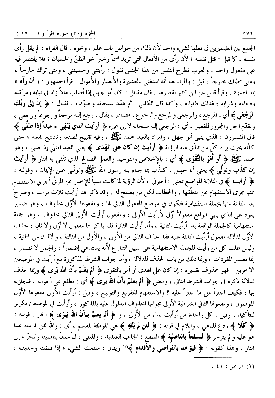 أَيِ: الْمَرْجِعَ، وَالرُّجْعَى وَالْمَرْجِعُ وَالرُّجُوعُ: مَصَادِرُ، يُقَالُ: رَجَعَ إِلَيْهِ مَرْجِعًا وَرُجُوعًا وَرُجْعَى، وَتَقَدَّمَ الْجَارُّ وَالْمَجْرُورُ لِلْقَصْرِ، أَيِ: الرُّجْعَى إِلَيْهِ سُبْحَانَهُ لَا إِلَى غَيْرِهِ أَرَأَيْتَ الَّذِي يَنْهى - عَبْداً إِذا صَلَّى قَالَ الْمُفَسِّرُونَ: الَّذِي يَنْهَى أَبُو جَهْلٍ، وَالْمُرَادُ بِالْعَبْدِ مُحَمَّدٌ صَلَّى اللَّهُ عَلَيْهِ وَسَلَّمَ، وَفِيهِ تَقْبِيحٌ لِصُنْعِهِ وَتَشْنِيعٌ لِفِعْلِهِ حَتَّى كَأَنَّهُ بِحَيْثُ يَرَاهُ كُلُّ مَنْ تَتَأَتَّى مِنْهُ الرُّؤْيَةُ أَرَأَيْتَ إِنْ كانَ عَلَى الْهُدى يَعْنِي الْعَبْدَ الْمَنْهِيَّ إِذَا صَلَّى، وَهُوَ مُحَمَّدٌ صَلَّى اللَّهُ عَلَيْهِ وَسَلَّمَ أَوْ أَمَرَ بِالتَّقْوى أَيْ: بِالْإِخْلَاصِ وَالتَّوْحِيدِ وَالْعَمَلِ الصَّالِحِ الَّذِي تُتَّقَى بِهِ النَّارُ أَرَأَيْتَ إِنْ كَذَّبَ وَتَوَلَّى يَعْنِي أَبَا جَهْلٍ، كَذَّبَ بِمَا جَاءَ بِهِ رَسُولُ اللَّهِ صَلَّى اللَّهُ عَلَيْهِ وَسَلَّمَ وَتَوَلَّى عَنِ الْإِيمَانِ، وَقَوْلُهُ: