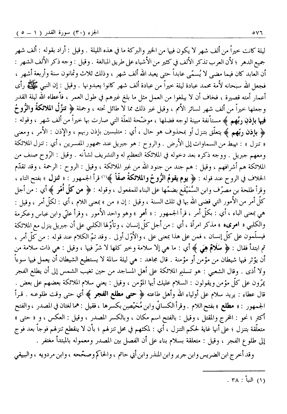 قَالَ عَطَاءٌ: يُرِيدُ سَلَامٌ عَلَى أَوْلِيَاءِ اللَّهِ وَأَهْلِ طَاعَتِهِ حَتَّى مَطْلَعِ الْفَجْرِ أَيْ حَتَّى وَقْتِ طُلُوعِهِ. قَرَأَ الْجُمْهُورُ: «مَطْلَعِ» بِفَتْحِ اللَّامِ. وَقَرَأَ الْكِسَائِيُّ وَابْنُ مُحَيْصِنٍ بِكَسْرِهَا، فَقِيلَ: هُمَا لُغَتَانِ فِي الْمَصْدَرِ، وَالْفَتْحُ أَكْثَرُ نَحْوَ: الْمَخْرَجِ وَالْمَقْتَلِ، وَقِيلَ: بِالْفَتْحِ اسْمُ مَكَانٍ، وَبِالْكَسْرِ الْمَصْدَرُ، وقيل: العكس، و «حتى» متعلّقة بتنزل عَلَى أَنَّهَا غَايَةٌ لِحُكْمِ التَّنَزُّلِ، أَيْ: لِمُكْثِهِمْ فِي مَحَلِّ تَنَزُّلِهِمْ بِأَنْ لَا يَنْقَطِعَ تَنَزُّلُهُمْ فَوْجًا بَعْدَ فَوْجٍ إِلَى طُلُوعِ الْفَجْرِ، وَقِيلَ: متعلقة بسلام بِنَاءً عَلَى أَنَّ الْفَصْلَ بَيْنَ الْمَصْدَرِ وَمَعْمُولِهِ بِالْمُبْتَدَأِ مُغْتَفَرٌ.