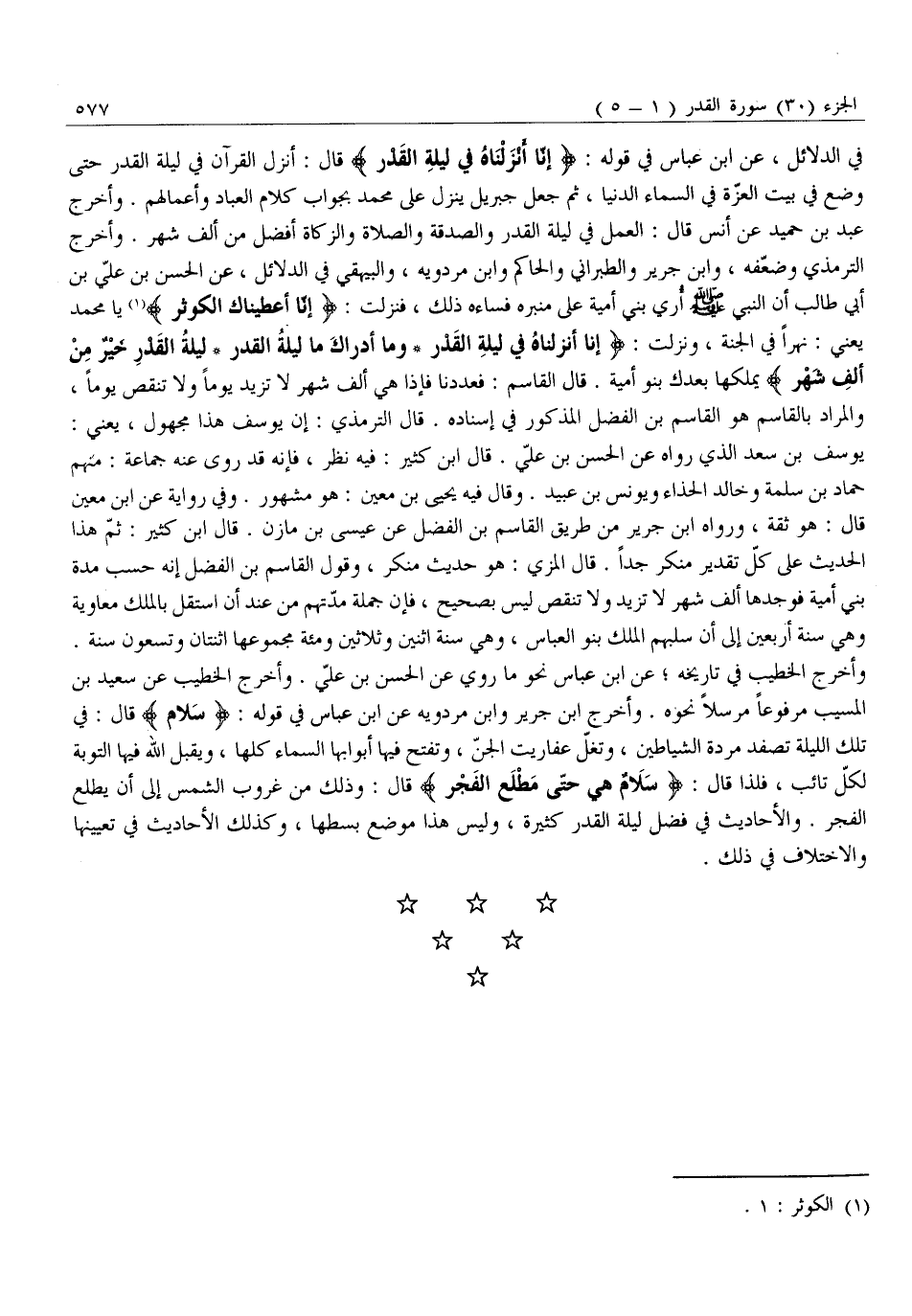 وَأَخْرَجَ الْخَطِيبُ فِي تَارِيخِهِ عَنِ ابْنِ عَبَّاسٍ نَحْوَ مَا رُوِيَ عَنِ الْحَسَنِ بْنِ عَلِيٍّ. وَأَخْرَجَ الْخَطِيبُ عَنْ سَعِيدِ بْنِ الْمُسَيَّبِ مَرْفُوعًا مُرْسَلًا نَحْوَهُ. وَأَخْرَجَ ابْنُ جَرِيرٍ وَابْنُ مَرْدَوَيْهِ عَنِ ابْنِ عَبَّاسٍ فِي قَوْلِهِ: سَلامٌ قَالَ: فِي تِلْكَ اللَّيْلَةِ تُصَفَّدُ مَرَدَةُ الشَّيَاطِينِ، وَتُغَلُّ عَفَارِيتُ الْجِنِّ، وَتُفْتَحُ فِيهَا أبوابها السَّمَاءِ كُلُّهَا، وَيَقْبَلُ اللَّهُ فِيهَا التَّوْبَةَ لِكُلِّ تَائِبٍ، فَلِذَا قَالَ: سَلامٌ هِيَ حَتَّى مَطْلَعِ الْفَجْرِ قَالَ: وَذَلِكَ مِنْ غُرُوبِ الشَّمْسِ إِلَى أَنْ يَطْلُعَ الْفَجْرُ. وَالْأَحَادِيثُ فِي فَضْلِ لَيْلَةِ الْقَدْرِ كَثِيرَةٌ، وَلَيْسَ هَذَا مَوْضِعَ بَسْطِهَا، وَكَذَلِكَ الأحاديث في تعيينها والاختلاف في ذلك.