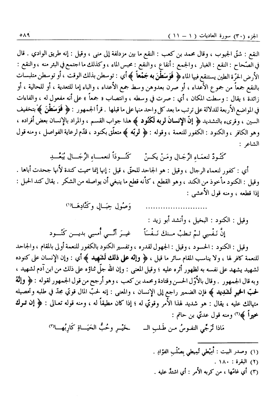 الْأَرْضُ الْحُرَّةُ الطِّينِ يَسْتَنْقِعُ فِيهَا الْمَاءُ فَوَسَطْنَ بِهِ جَمْعاً أَيْ: تَوَسَّطْنَ بِذَلِكَ الْوَقْتِ، أَوْ تَوَسَّطْنَ متلبسات بِالنَّقْعِ جَمْعًا مِنْ جُمُوعِ الْأَعْدَاءِ، أَوْ صِرْنَ بِعَدْوِهِنَّ وَسَطَ جَمْعِ الْأَعْدَاءِ، وَالْبَاءُ إِمَّا لِلتَّعْدِيَةِ، أَوْ لِلْحَالِيَّةِ، أَوْ زَائِدَةٌ يُقَالُ: وَسَطْتُ الْمَكَانَ، أَيْ: صِرْتُ فِي وَسَطِهِ، وَانْتِصَابُ «جَمْعًا» عَلَى أنه مفعول له، وَالْفَاءَاتُ فِي الْمَوَاضِعِ الْأَرْبَعَةِ لِلدَّلَالَةِ عَلَى تَرَتُّبِ ما بعد كل واحد مِنْهَا عَلَى مَا قَبْلَهَا. قَرَأَ الْجُمْهُورُ: فَوَسَطْنَ بِتَخْفِيفِ السِّينِ، وَقُرِئَ بِالتَّشْدِيدِ إِنَّ الْإِنْسانَ لِرَبِّهِ لَكَنُودٌ هَذَا جَوَابُ الْقَسَمِ، وَالْمُرَادُ بِالْإِنْسَانِ بَعْضُ أَفْرَادِهِ، وَهُوَ الْكَافِرُ، وَالْكَنُودُ: الْكَفُورُ لِلنِّعْمَةِ، وَقَوْلُهُ: لِرَبِّهِ مُتَعَلِّقٌ بِكَنُودٍ، قُدِّمَ لِرِعَايَةِ الْفَوَاصِلِ، وَمِنْهُ قَوْلُ الشَّاعِرِ: