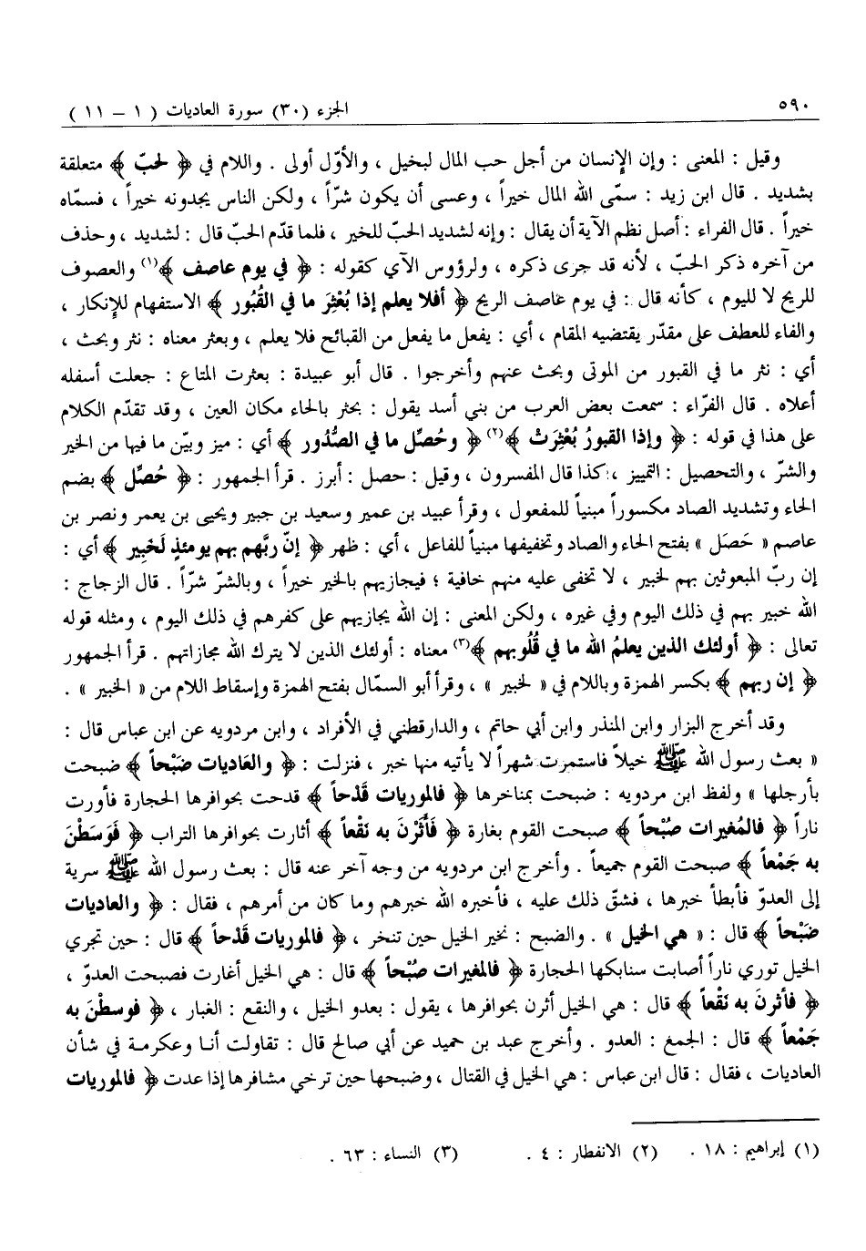 «بَعَثَ رَسُولُ اللَّهِ صَلَّى اللَّهُ عَلَيْهِ وَسَلَّمَ خَيْلًا فَاسْتَمَرَّتْ شَهْرًا لَا يَأْتِيهِ مِنْهَا خَبَرٌ، فَنَزَلَتْ: وَالْعادِياتِ ضَبْحاً ضَبَحَتْ بِأَرْجُلِهَا» وَلَفْظُ ابْنِ مَرْدَوَيْهِ: ضَبَحَتْ بِمَنَاخِرِهَا فَالْمُورِياتِ قَدْحاً قَدَحَتْ بِحَوَافِرِهَا الْحِجَارَةَ فَأَوْرَتْ نَارًا فَالْمُغِيراتِ صُبْحاً صَبَّحَتِ الْقَوْمَ بِغَارَةٍ فَأَثَرْنَ بِهِ نَقْعاً أَثَارَتْ بِحَوَافِرِهَا التُّرَابَ فَوَسَطْنَ بِهِ جَمْعاً صَبَّحَتِ الْقَوْمَ جَمِيعًا. وَأَخْرَجَ ابْنُ مَرْدَوَيْهِ مِنْ وَجْهٍ آخَرَ عَنْهُ قَالَ: بَعَثَ رَسُولُ اللَّهِ صَلَّى اللَّهُ عَلَيْهِ وَسَلَّمَ سَرِيَّةً إِلَى الْعَدُوِّ فَأَبْطَأَ خَبَرُهَا، فَشَقَّ ذَلِكَ عَلَيْهِ، فَأَخْبَرَهُ اللَّهُ خَبَرَهُمْ وَمَا كَانَ مِنْ أَمْرِهِمْ، فَقَالَ: وَالْعادِياتِ ضَبْحاً قَالَ: «هِيَ الْخَيْلُ» . وَالضَّبْحُ: نَخِيرُ الْخَيْلِ حِينَ تَنْخُرُ، فَالْمُورِياتِ قَدْحاً قَالَ: حِينَ تَجْرِي الْخَيْلُ تُورِي نَارًا أَصَابَتْ سَنَابِكُهَا الْحِجَارَةَ فَالْمُغِيراتِ صُبْحاً قَالَ: هِيَ الْخَيْلُ أَغَارَتْ فَصَبَّحَتِ الْعَدُوَّ، فَأَثَرْنَ بِهِ نَقْعاً قَالَ: هِيَ الْخَيْلُ أَثَرْنَ بِحَوَافِرِهَا، يَقُولُ: بِعَدْوِ الْخَيْلِ، وَالنَّقْعُ: الْغُبَارُ، فَوَسَطْنَ بِهِ جَمْعاً قَالَ: الْجَمْعُ: الْعَدُوُّ. وَأَخْرَجَ عَبْدُ بْنُ حُمَيْدٍ عَنْ أَبِي صَالِحٍ قَالَ: تَقَاوَلْتُ أَنَا وَعِكْرِمَةُ فِي شَأْنِ الْعَادِيَّاتِ، فَقَالَ: قَالَ ابْنُ عَبَّاسٍ: هِيَ الْخَيْلُ فِي الْقِتَالِ، وَضَبْحُهَا حِينَ ترخي مشافرها إذا عدت فَالْمُورِياتِ قَدْحاً
