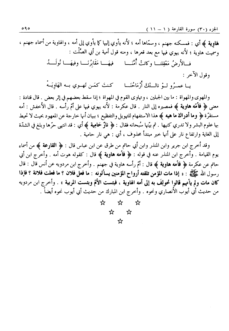 وَقَدْ أَخْرَجَ ابْنُ جَرِيرٍ وَابْنُ الْمُنْذِرِ وَابْنُ أَبِي حَاتِمٍ مِنْ طُرُقٍ عَنِ ابْنِ عَبَّاسٍ قَالَ: الْقارِعَةُ مِنْ أَسْمَاءِ يَوْمِ الْقِيَامَةِ. وَأَخْرَجَ ابْنُ الْمُنْذِرِ عَنْهُ فِي قَوْلِهِ: فَأُمُّهُ هاوِيَةٌ قَالَ: كَقَوْلِهِ هَوَتْ أُمُّهُ. وَأَخْرَجَ ابْنُ أَبِي حَاتِمٍ عَنْ عِكْرِمَةَ فَأُمُّهُ هاوِيَةٌ قَالَ: أُمُّ رَأْسِهِ هَاوِيَةٌ فِي جَهَنَّمَ. وَأَخْرَجَ ابْنُ مَرْدَوَيْهِ عَنْ أَنَسٍ قَالَ: قَالَ رَسُولُ اللَّهِ صَلَّى اللَّهُ عَلَيْهِ وَسَلَّمَ: «إِذَا مَاتَ الْمُؤْمِنُ تَلَقَّتْهُ أَرْوَاحُ الْمُؤْمِنِينَ يَسْأَلُونَهُ: مَا فَعَلَ فُلَانٌ؟ مَا فَعَلَتْ فُلَانَةُ؟ فَإِذَا كَانَ مَاتَ وَلَمْ يَأْتِهِمْ قَالُوا خُولِفَ بِهِ إِلَى أُمِّهِ الْهَاوِيَةِ، فَبِئْسَتِ الْأُمُّ وَبِئْسَتِ الْمُرَبِّيَةُ» . وَأَخْرَجَ ابْنُ مَرْدَوَيْهِ مِنْ حَدِيثِ أَبِي أَيُّوبَ الأنصاري ونحوه. وَأَخْرَجَ ابْنُ الْمُبَارَكِ مِنْ حَدِيثِ أَبِي أَيُّوبَ نحوه أيضا.