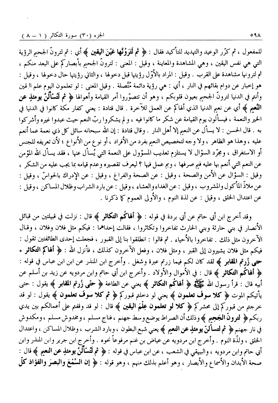 هُوَ إِخْبَارٌ عَنْ دَوَامِ بَقَائِهِمْ فِي النَّارِ، أَيْ: هِيَ رُؤْيَةٌ دَائِمَةٌ مُتَّصِلَةٌ. وَقِيلَ الْمَعْنَى: لَوْ تَعْلَمُونَ الْيَوْمَ عِلْمَ الْيَقِينِ وَأَنْتُمْ فِي الدُّنْيَا لَتَرَوُنَّ الجحيم بعيون قُلُوبِكُمْ، وَهُوَ أَنْ تَتَصَوَّرُوا أَمْرَ الْقِيَامَةِ وَأَهْوَالَهَا ثُمَّ لَتُسْئَلُنَّ يَوْمَئِذٍ عَنِ النَّعِيمِ أَيْ عَنْ نَعِيمِ الدُّنْيَا الَّذِي أَلْهَاكُمْ عَنِ الْعَمَلِ لِلْآخِرَةِ. قَالَ قَتَادَةُ: يَعْنِي كُفَّارَ مَكَّةَ كَانُوا فِي الدُّنْيَا فِي الْخَيْرِ وَالنِّعْمَةِ، فَيُسْأَلُونَ يَوْمَ الْقِيَامَةِ عَنْ شُكْرِ مَا كَانُوا فِيهِ، وَلَمْ يَشْكُرُوا رَبَّ النِّعَمِ حَيْثُ عَبَدُوا غَيْرَهُ وَأَشْرَكُوا بِهِ. قَالَ الْحَسَنُ: لَا يُسْأَلُ عَنِ النَّعِيمِ إِلَّا أَهْلُ النَّارِ. وَقَالَ قَتَادَةُ: إِنَّ اللَّهَ سُبْحَانَهُ سَائِلٌ كُلَّ ذِي نِعْمَةٍ عَمَّا أَنْعَمَ عَلَيْهِ، وَهَذَا هُوَ الظَّاهِرُ، وَلَا وَجْهَ لِتَخْصِيصِ النَّعِيمِ بِفَرْدٍ مِنَ الْأَفْرَادِ، أَوْ نَوْعٍ مِنَ الْأَنْوَاعِ لِأَنَّ تَعْرِيفَهُ لِلْجِنْسِ أَوِ الِاسْتِغْرَاقِ، وَمُجَرَّدُ السُّؤَالِ لَا يَسْتَلْزِمُ تعذيب المسؤول عَلَى النِّعْمَةِ الَّتِي يُسْأَلُ عَنْهَا، فَقَدْ يَسْأَلُ اللَّهُ الْمُؤْمِنَ عَنِ النِّعَمِ الَّتِي أَنْعَمَ بِهَا عَلَيْهِ فِيمَ صَرَفَهَا، وَبِمَ عَمِلَ فِيهَا؟ لِيَعْرِفَ تَقْصِيرَهُ وَعَدَمَ قِيَامِهِ بِمَا يَجِبُ عَلَيْهِ مِنَ الشُّكْرِ، وَقِيلَ: السُّؤَالُ عَنِ الْأَمْنِ وَالصِّحَّةِ، وَقِيلَ: عَنِ الصِّحَّةِ وَالْفَرَاغِ، وَقِيلَ: عَنِ الْإِدْرَاكِ بِالْحَوَاسِّ، وَقِيلَ: