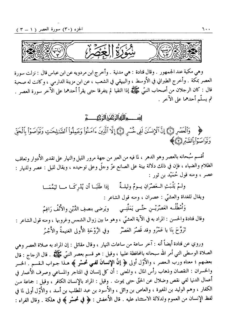 وَرُوِيَ عَنْ قَتَادَةَ أَيْضًا أَنَّهُ: آخِرُ سَاعَةٍ مِنْ سَاعَاتِ النَّهَارِ، وَقَالَ مُقَاتِلٌ: إِنَّ الْمُرَادَ بِهِ صَلَاةُ الْعَصْرِ وَهِيَ الصَّلَاةُ الْوُسْطَى الَّتِي أَمَرَ اللَّهُ سُبْحَانَهُ بِالْمُحَافَظَةِ عَلَيْهَا، وَقِيلَ: هُوَ قَسَمٌ بِعَصْرِ النَّبِيِّ صَلَّى اللَّهُ عَلَيْهِ وَسَلَّمَ. قَالَ الزَّجَّاجُ: قَالَ بَعْضُهُمْ مَعْنَاهُ وَرَبِّ الْعَصْرِ، وَالْأَوَّلُ أَوْلَى إِنَّ الْإِنْسانَ لَفِي خُسْرٍ هَذَا جَوَابُ الْقَسَمِ. الْخُسْرُ وَالْخُسْرَانُ: النُّقْصَانُ وَذَهَابُ رَأْسِ الْمَالِ، وَالْمَعْنَى: أَنَّ كُلَّ إِنْسَانٍ فِي الْمَتَاجِرِ وَالْمَسَاعِي وَصَرْفِ الْأَعْمَارِ فِي أَعْمَالِ الدُّنْيَا لَفِي نَقْصٍ وَضَلَالٍ عَنِ الْحَقِّ حَتَّى يَمُوتَ. وَقِيلَ: الْمُرَادُ بِالْإِنْسَانِ الْكَافِرُ، وَقِيلَ: جَمَاعَةٌ مِنَ الْكُفَّارِ، وَهُمُ الْوَلِيدُ بْنُ الْمُغِيرَةِ، وَالْعَاصُ بْنُ وَائِلٍ، وَالْأَسْوَدُ بْنُ عَبْدِ الْمُطَّلِبِ بْنِ أَسَدٍ، وَالْأَوَّلُ أَوْلَى لِمَا فِي لَفْظِ الْإِنْسَانِ مِنَ الْعُمُومِ وَلِدَلَالَةِ الِاسْتِثْنَاءِ عَلَيْهِ. قَالَ الْأَخْفَشُ: لَفِي خُسْرٍ فِي هَلَكَةٍ. وَقَالَ الْفَرَّاءُ: