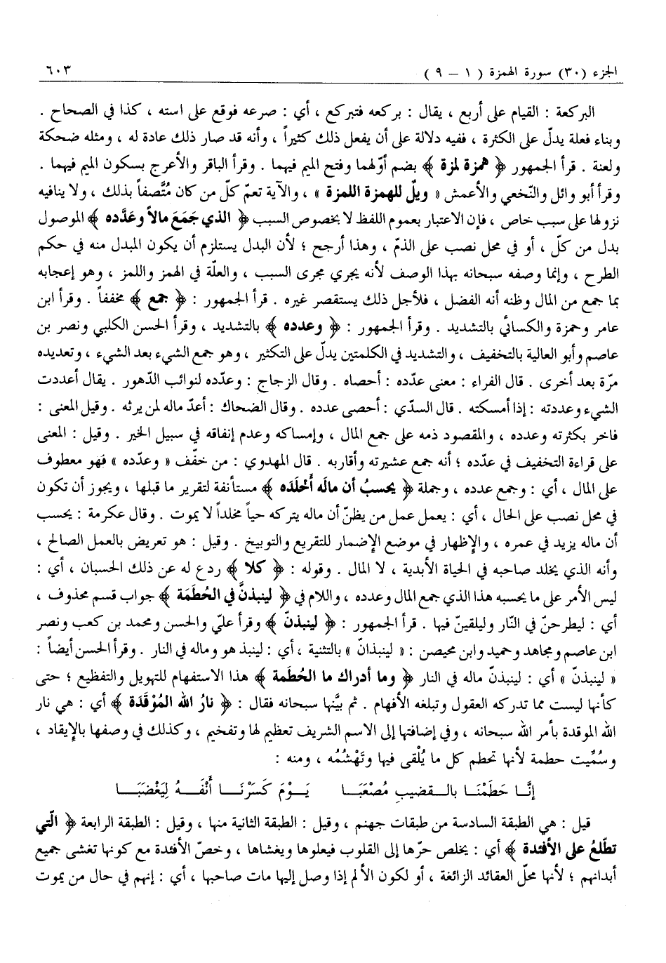وَقَرَأَ أَبُو وَائِلٍ وَالنَّخَعِيُّ وَالْأَعْمَشُ «وَيْلٌ لِلْهُمَزَةِ اللُّمَزَةِ» ، وَالْآيَةُ تَعُمُّ كُلَّ مَنْ كَانَ مُتَّصِفًا بِذَلِكَ، وَلَا يُنَافِيهِ نُزُولُهَا عَلَى سَبَبٍ خَاصٍّ، فَإِنَّ الِاعْتِبَارَ بِعُمُومِ اللَّفْظِ لَا بِخُصُوصِ السَّبَبِ الَّذِي جَمَعَ مَالًا وَعَدَّدَهُ الْمَوْصُولُ بَدَلٌ مِنْ كُلِّ، أَوْ فِي مَحَلِّ نَصْبٍ عَلَى الذَّمِّ، وَهَذَا أَرْجَحُ لِأَنَّ الْبَدَلَ يَسْتَلْزِمُ أَنْ يَكُونَ الْمُبْدَلُ مِنْهُ فِي حُكْمِ الطَّرْحِ، وَإِنَّمَا وَصَفَهُ سُبْحَانَهُ بِهَذَا الْوَصْفِ لِأَنَّهُ يَجْرِي مَجْرَى السَّبَبِ، وَالْعِلَّةُ فِي الْهَمْزِ وَاللَّمْزِ، وَهُوَ إِعْجَابُهُ بِمَا جَمَعَ مِنَ الْمَالِ وَظَنَّهُ أَنَّهُ الْفَضْلُ، فَلِأَجْلِ ذَلِكَ يَسْتَقْصِرُ غَيْرَهُ. قَرَأَ الْجُمْهُورُ: جَمَعَ مُخَفَّفًا. وَقَرَأَ ابْنُ عَامِرٍ وَحَمْزَةُ وَالْكِسَائِيُّ بِالتَّشْدِيدِ. وَقَرَأَ الْجُمْهُورُ: وَعَدَّدَهُ بالتشديد، وقرأ الحسن الكلبي وَنَصْرُ بْنُ عَاصِمٍ وَأَبُو الْعَالِيَةِ بِالتَّخْفِيفِ، وَالتَّشْدِيدُ فِي الْكَلِمَتَيْنِ يَدُلُّ عَلَى التَّكْثِيرِ، وَهُوَ جَمْعُ الشَّيْءِ بَعْدَ الشَّيْءِ، وَتَعْدِيدُهُ مَرَّةً بَعْدَ أُخْرَى. قَالَ الْفَرَّاءُ: مَعْنَى عَدَّدَهُ: أَحْصَاهُ. وَقَالَ الزَّجَّاجُ: وَعَدَّدَهُ لِنَوَائِبِ الدُّهُورِ. يُقَالُ أَعْدَدْتُ الشَّيْءَ وَعَدَدْتُهُ: إِذَا أَمْسَكْتَهُ. قَالَ السُّدِّيُّ: أَحْصَى عَدَدَهُ. وَقَالَ الضَّحَّاكُ: أَعَدَّ مَالَهُ لِمَنْ يَرِثُهُ. وَقِيلَ الْمَعْنَى: