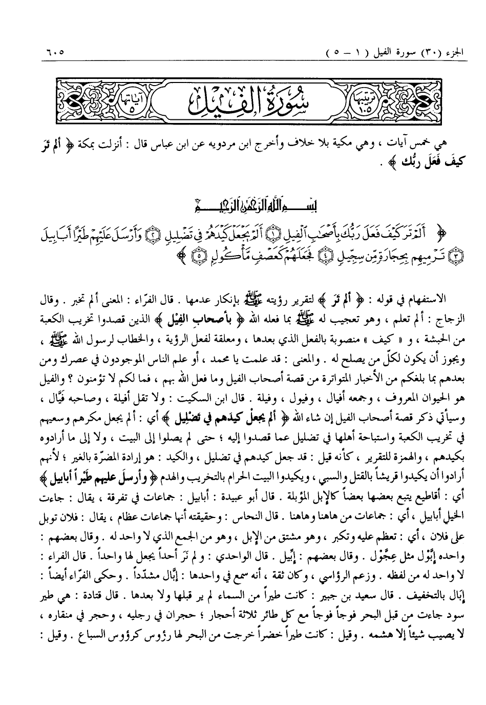الِاسْتِفْهَامُ فِي قَوْلِهِ: أَلَمْ تَرَ لِتَقْرِيرِ رُؤْيَتِهِ صَلَّى اللَّهُ عَلَيْهِ وَسَلَّمَ بِإِنْكَارِ عَدَمِهَا. قَالَ الْفَرَّاءُ: الْمَعْنَى أَلَمْ تُخْبِرْ. وَقَالَ الزَّجَّاجُ: أَلَمْ تَعْلَمْ، وَهُوَ تَعْجِيبٌ لَهُ صَلَّى اللَّهُ عَلَيْهِ وَسَلَّمَ بِمَا فَعَلَهُ اللَّهُ بِأَصْحابِ الْفِيلِ الَّذِينَ قَصَدُوا تخريب الكعبة من الحبشة، و «كيف» مَنْصُوبَةٌ بِالْفِعْلِ الَّذِي بَعْدَهَا، وَمُعَلِّقَةٌ لِفِعْلِ الرُّؤْيَةِ، وَالْخِطَابُ لِرَسُولِ اللَّهِ صَلَّى اللَّهُ عَلَيْهِ وَسَلَّمَ، وَيَجُوزُ أَنْ يَكُونَ لِكُلِّ مَنْ يَصْلُحُ لَهُ. وَالْمَعْنَى: قَدْ عَلِمْتَ يَا مُحَمَّدُ، أَوْ عَلِمَ النَّاسُ الْمَوْجُودُونَ فِي عَصْرِكَ وَمَنْ بَعْدَهُمْ بِمَا بَلَغَكُمْ مِنَ الْأَخْبَارِ الْمُتَوَاتِرَةِ مِنْ قِصَّةِ أَصْحَابِ الْفِيلِ وَمَا فَعَلَ اللَّهُ بِهِمْ، فَمَا لَكُمْ لَا تُؤْمِنُونَ؟ وَالْفِيلُ هُوَ الْحَيَوَانُ الْمَعْرُوفُ، وَجَمْعُهُ أَفْيَالٌ، وَفُيُولٌ، وَفِيَلَةٌ. قَالَ ابْنُ السِّكِّيتِ: وَلَا تقل أَفْيِلَةٌ، وَصَاحِبُهُ فَيَّالٌ، وَسَيَأْتِي ذِكْرُ قِصَّةِ أَصْحَابِ الْفِيلِ إِنْ شَاءَ اللَّهُ أَلَمْ يَجْعَلْ كَيْدَهُمْ فِي تَضْلِيلٍ أَيْ: أَلَمْ يَجْعَلْ مَكْرَهُمْ وَسَعْيَهُمْ فِي تَخْرِيبِ الْكَعْبَةِ وَاسْتِبَاحَةِ أَهْلِهَا فِي تَضْلِيلٍ عَمَّا قَصَدُوا إِلَيْهِ حَتَّى لَمْ يَصِلُوا إِلَى الْبَيْتِ، وَلَا إِلَى مَا أَرَادُوهُ بِكَيْدِهِمْ، وَالْهَمْزَةُ لِلتَّقْرِيرِ، كَأَنَّهُ قِيلَ: قَدْ جَعَلَ كَيْدَهُمْ فِي تَضْلِيلٍ، وَالْكَيْدُ: هُوَ إِرَادَةُ الْمَضَرَّةِ بِالْغَيْرِ لِأَنَّهُمْ أَرَادُوا أَنْ يَكِيدُوا قُرَيْشًا بِالْقَتْلِ وَالسَّبْيِ، وَيَكِيدُوا البيت الحرام بالتخريب والهدم وَأَرْسَلَ عَلَيْهِمْ طَيْراً أَبابِيلَ أَيْ: أَقَاطِيعَ يَتْبَعُ بَعْضُهَا بَعْضًا كَالْإِبِلِ الْمُؤَبَّلَةِ. قَالَ أَبُو عُبَيْدَةَ: أَبَابِيلَ: جَمَاعَاتٍ فِي تَفْرِقَةٍ، يُقَالُ: جَاءَتِ الْخَيْلُ أَبَابِيلَ، أَيْ: جَمَاعَاتٍ مِنْ هَاهُنَا وَهَاهُنَا. قَالَ النَّحَّاسُ: وَحَقِيقَتُهُ أَنَّهَا جَمَاعَاتٌ عِظَامٌ، يُقَالُ: فُلَانٌ توبل عَلَى فُلَانٍ، أَيْ: تَعَظَّمَ عَلَيْهِ وَتَكَبَّرَ، وَهُوَ مُشْتَقٌّ مِنَ الْإِبِلِ، وَهُوَ مِنَ الْجَمْعِ الَّذِي لَا وَاحِدَ لَهُ. وَقَالَ بَعْضُهُمْ:
