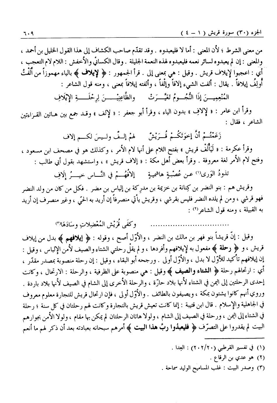 وَقِيلَ: إِنَّ قُرَيْشًا بَنُو فِهْرِ بْنِ مَالِكِ بْنِ النَّضْرِ، وَالْأَوَّلُ أَصَحُّ، وَقَوْلُهُ: إِيلافِهِمْ بدل من إيلاف قريش، ورِحْلَةَ مَفْعُولٌ بِهِ لِإِيلَافِهِمْ وَأَفْرَدَهَا، وَلَمْ يَقُلْ رِحْلَتَيِ الشِّتَاءِ وَالصَّيْفِ لِأَمْنِ الْإِلْبَاسِ، وَقِيلَ: