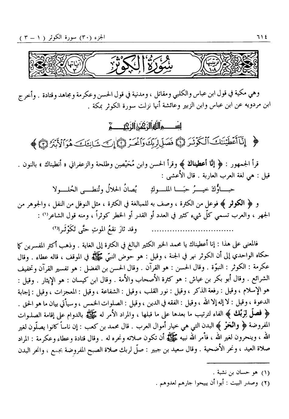 فَالْمَعْنَى عَلَى هَذَا: إِنَّا أَعْطَيْنَاكَ يَا مُحَمَّدُ الْخَيْرَ الْكَثِيرَ الْبَالِغَ فِي الْكَثْرَةِ إِلَى الْغَايَةِ. وَذَهَبَ أَكْثَرُ الْمُفَسِّرِينَ كَمَا حَكَاهُ الْوَاحِدِيُّ إِلَى أَنَّ الْكَوْثَرَ نَهْرٌ فِي الْجَنَّةِ، وَقِيلَ: هُوَ حَوْضُ النَّبِيِّ صَلَّى اللَّهُ عَلَيْهِ وَسَلَّمَ فِي الْمَوْقِفِ، قَالَهُ عَطَاءٌ. وَقَالَ عِكْرِمَةُ: الْكَوْثَرُ: النُّبُوَّةُ. وَقَالَ الْحَسَنُ: هُوَ الْقُرْآنُ. وَقَالَ الْحَسَنُ بْنُ الْفَضْلِ: هُوَ تَفْسِيرُ الْقُرْآنِ وَتَخْفِيفُ الشَّرَائِعِ. وَقَالَ أَبُو بَكْرِ بْنُ عَيَّاشٍ: هُوَ كَثْرَةُ الْأَصْحَابِ وَالْأُمَّةِ. وَقَالَ ابْنُ كَيْسَانَ: هُوَ الْإِيثَارُ. وَقِيلَ: