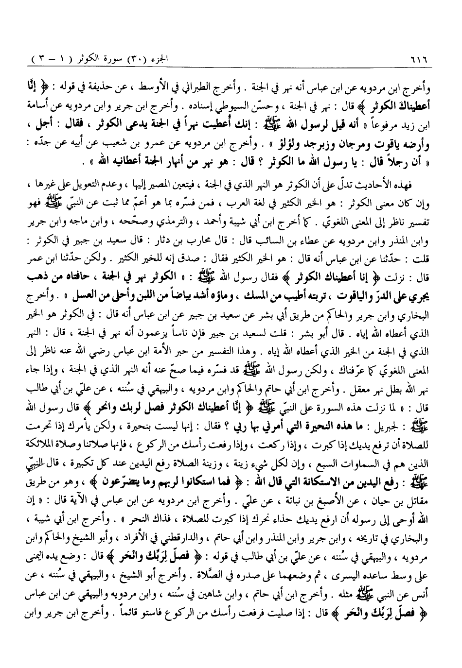 قُلْتُ: حَدَّثَنَا عَنِ ابْنِ عَبَّاسٍ أَنَّهُ قَالَ: هُوَ الْخَيْرُ الْكَثِيرُ فَقَالَ: صَدَقَ إِنَّهُ لَلْخَيْرُ الْكَثِيرُ. وَلَكِنْ حَدَّثَنَا ابْنُ عُمَرَ قَالَ: نَزَلَتْ إِنَّا أَعْطَيْناكَ الْكَوْثَرَ فَقَالَ رَسُولُ اللَّهِ صَلَّى اللَّهُ عَلَيْهِ وَسَلَّمَ: «الْكَوْثَرُ نَهْرٌ فِي الْجَنَّةِ، حَافَّتَاهُ مِنْ ذَهَبٍ يَجْرِي عَلَى الدُّرِّ وَالْيَاقُوتِ، تُرْبَتُهُ أَطْيَبُ مِنَ الْمِسْكِ، وَمَاؤُهُ أَشَدَّ بَيَاضًا مِنَ اللَّبَنِ وَأَحْلَى مِنَ الْعَسَلِ» . وَأَخْرَجَ الْبُخَارِيُّ وَابْنُ جَرِيرٍ وَالْحَاكِمُ مِنْ طَرِيقِ أَبِي بِشْرٍ عَنْ سَعِيدِ بْنِ جُبَيْرٍ عَنِ ابْنِ عَبَّاسٍ أَنَّهُ قَالَ: فِي الْكَوْثَرِ هُوَ الْخَيْرُ الَّذِي أَعْطَاهُ اللَّهُ إِيَّاهُ. قَالَ أَبُو بِشْرٍ: قُلْتُ لِسَعِيدِ بْنِ جُبَيْرٍ فَإِنَّ نَاسًا يَزْعُمُونَ أَنَّهُ نَهْرٌ فِي الْجَنَّةِ، قَالَ: النَّهْرُ الَّذِي فِي الْجَنَّةِ مِنَ الْخَيْرِ الَّذِي أَعْطَاهُ اللَّهُ إِيَّاهُ. وَهَذَا التَّفْسِيرُ مِنْ حَبْرِ الْأُمَّةِ ابْنِ عَبَّاسٍ رَضِيَ اللَّهُ عَنْهُ نَاظِرٌ إِلَى الْمَعْنَى اللُّغَوِيِّ كَمَا عَرَفْنَاكَ، وَلَكِنَّ رَسُولُ اللَّهِ صَلَّى اللَّهُ عَلَيْهِ وَسَلَّمَ قَدْ فَسَّرَهُ فِيمَا صَحَّ عَنْهُ أَنَّهُ النَّهْرُ الَّذِي فِي الْجَنَّةِ، وَإِذَا جَاءَ نَهْرُ اللَّهِ بَطَلَ نَهْرُ مَعْقِلٍ. وَأَخْرَجَ ابْنِ أَبِي حَاتِمٍ وَالْحَاكِمُ وَابْنُ مَرْدَوَيْهِ، وَالْبَيْهَقِيُّ فِي سُنَنِهِ، عَنْ عَلِيِّ بْنِ أَبِي طَالِبً قَالَ: «لَمَّا نَزَلَتْ هَذِهِ السُّورَةُ عَلَى النَّبِيِّ صَلَّى اللَّهُ عَلَيْهِ وَسَلَّمَ إِنَّا أَعْطَيْناكَ الْكَوْثَرَ فَصَلِّ لِرَبِّكَ وَانْحَرْ قَالَ رَسُولُ اللَّهِ صَلَّى اللَّهُ عَلَيْهِ وَسَلَّمَ: لِجِبْرِيلَ: مَا هَذِهِ النَّحِيرَةُ الَّتِي أَمَرَنِي بِهَا رَبِّي؟ فَقَالَ: إِنَّهَا لَيْسَتْ بِنَحِيرَةٍ، وَلَكِنْ يَأْمُرُكَ إِذَا تَحَرَّمْتَ لِلصَّلَاةِ أَنْ تَرْفَعَ يَدَيْكَ إِذَا كَبَّرْتَ، وَإِذَا رَكَعْتَ، وَإِذَا رَفَعْتَ رَأْسَكَ مِنَ الرُّكُوعِ، فَإِنَّهَا صَلَاتُنَا وَصَلَاةُ الْمَلَائِكَةِ الَّذِينَ هُمْ فِي السَّمَاوَاتِ السَّبْعِ، وَإِنَّ لِكُلِّ شَيْءٍ زِينَةً، وَزِينَةُ الصَّلَاةِ رَفْعُ الْيَدَيْنِ عِنْدَ كُلِّ تَكْبِيرَةٍ، قَالَ النَّبِيُّ صَلَّى اللَّهُ عَلَيْهِ وَسَلَّمَ: رَفْعُ الْيَدَيْنِ مِنَ الِاسْتِكَانَةِ الَّتِي قَالَ اللَّهُ: فَمَا اسْتَكانُوا لِرَبِّهِمْ وَما يَتَضَرَّعُونَ، وَهُوَ مِنْ طَرِيقِ مُقَاتِلِ بْنِ حَيَّانَ، عَنِ الْأَصْبَغِ بْنِ نُبَاتَةَ، عَنْ عَلِيٍّ. وَأَخْرَجَ ابْنُ مَرْدَوَيْهِ عَنِ ابْنِ عَبَّاسٍ فِي الْآيَةِ قَالَ: «إِنَّ اللَّهَ أَوْحَى إِلَى رَسُولِهِ أَنِ ارْفَعْ يَدَيْكَ حِذَاءَ نَحْرِكَ إِذَا كَبَّرْتَ لِلصَّلَاةِ، فَذَاكَ النَّحْرُ» . وَأَخْرَجَ ابْنُ أَبِي شَيْبَةَ، وَالْبُخَارِيُّ فِي تَارِيخِهِ، وَابْنُ جَرِيرٍ وَابْنُ الْمُنْذِرِ وَابْنُ أَبِي حَاتِمٍ، وَالدَّارَقُطْنِيُّ فِي الْأَفْرَادِ، وَأَبُو الشَّيْخِ وَالْحَاكِمُ وَابْنُ مَرْدَوَيْهِ، وَالْبَيْهَقِيُّ فِي سُنَنِهِ، عَنْ عَلِيِّ بْنِ أَبِي طَالِبٍ فِي قَوْلِهِ: فَصَلِّ لِرَبِّكَ وَانْحَرْ قَالَ: وَضَعَ يَدَهُ الْيُمْنَى عَلَى وَسَطِ سَاعِدِهِ الْيُسْرَى، ثُمَّ وَضَعَهُمَا عَلَى صَدْرِهِ فِي الصَّلَاةِ. وَأَخْرَجَ أَبُو الشَّيْخِ، وَالْبَيْهَقِيُّ فِي سُنَنِهِ، عَنْ أَنَسٍ عَنِ النَّبِيِّ صَلَّى اللَّهُ عَلَيْهِ وَسَلَّمَ مِثْلَهُ. وَأَخْرَجَ ابْنُ أَبِي حَاتِمٍ، وَابْنُ شَاهِينَ فِي سُنَنِهِ، وَابْنُ مَرْدَوَيْهِ وَالْبَيْهَقِيُّ عَنِ ابْنِ عَبَّاسٍ فَصَلِّ لِرَبِّكَ وَانْحَرْ قَالَ: إِذَا صَلَّيْتَ فَرَفَعْت