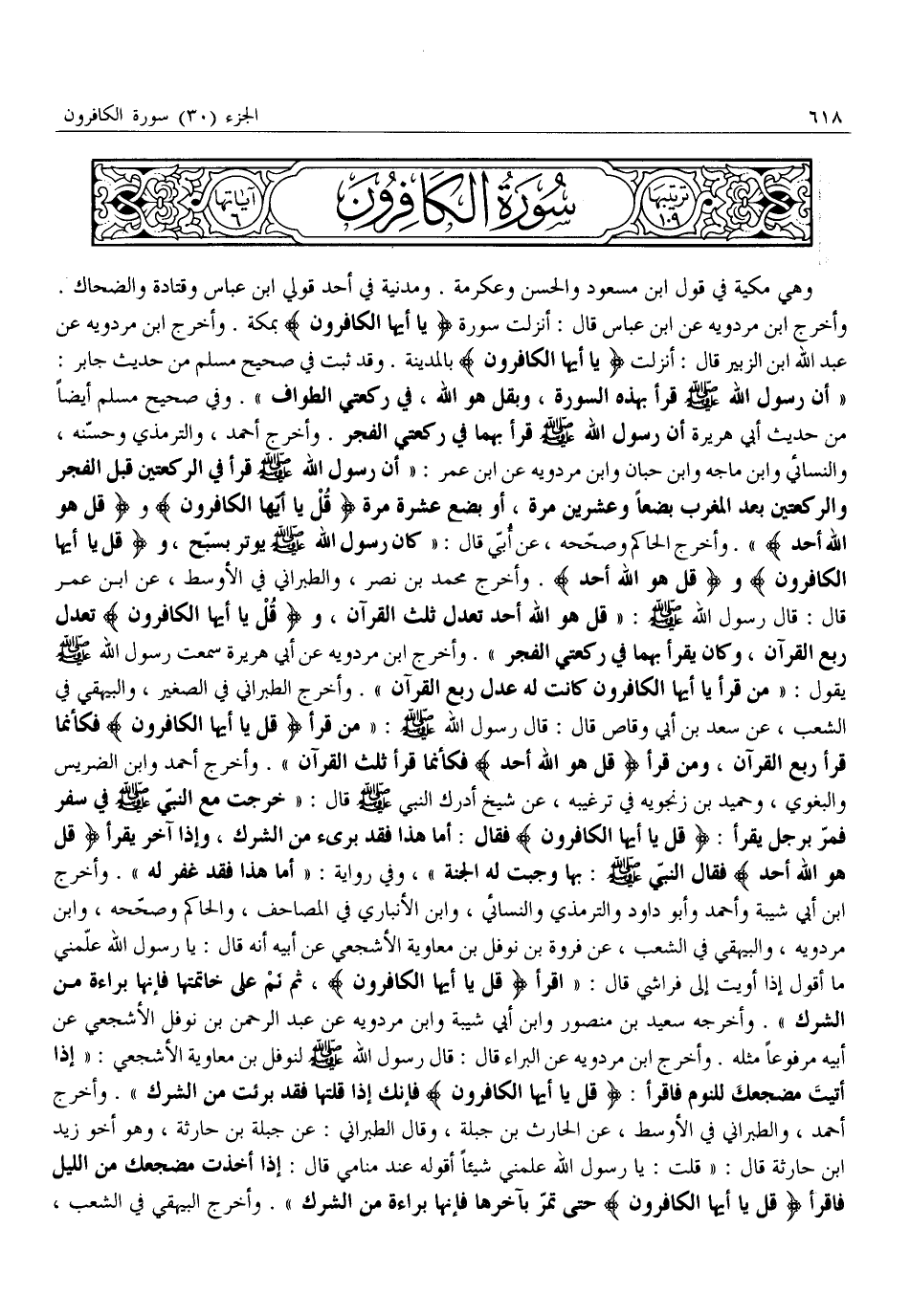 «أَنَّ رَسُولَ اللَّهِ صَلَّى اللَّهُ عَلَيْهِ وَسَلَّمَ قَرَأَ بِهَذِهِ السُّورَةِ، وَبِقُلْ هو الله، فِي رَكْعَتَيِ الطَّوَافِ» . وَفِي صَحِيحِ مُسْلِمٍ أَيْضًا مِنْ حَدِيثِ أَبِي هُرَيْرَةَ أَنَّ رَسُولَ اللَّهِ صَلَّى اللَّهُ عَلَيْهِ وَسَلَّمَ قَرَأَ بِهِمَا فِي رَكْعَتَيِ الْفَجْرِ. وَأَخْرَجَ أَحْمَدُ، وَالتِّرْمِذِيُّ وَحَسَّنَهُ، وَالنَّسَائِيُّ وَابْنُ مَاجَهْ وَابْنُ حِبَّانَ وَابْنُ مَرْدَوَيْهِ عَنِ ابْنِ عُمَرَ: «أَنَّ رَسُولَ اللَّهِ صَلَّى اللَّهُ عَلَيْهِ وَسَلَّمَ قَرَأَ فِي الرَّكْعَتَيْنِ قَبْلَ الْفَجْرِ وَالرَّكْعَتَيْنِ بَعْدَ الْمَغْرِبِ بِضْعًا وَعِشْرِينَ مَرَّةً، أَوْ بضع عشرة مرة قُلْ يَا أَيُّهَا الْكافِرُونَ وقُلْ هُوَ اللَّهُ أَحَدٌ» . وَأَخْرَجَ الْحَاكِمُ وَصَحَّحَهُ، عَنْ أُبَيٍّ قَالَ: «كَانَ رَسُولُ اللَّهِ صَلَّى اللَّهُ عَلَيْهِ وَسَلَّمَ يوتر بسبّح، وقُلْ يَا أَيُّهَا الْكافِرُونَ وقُلْ هُوَ اللَّهُ أَحَدٌ. وَأَخْرَجَ مُحَمَّدُ بْنُ نَصْرٍ، وَالطَّبَرَانِيُّ فِي الْأَوْسَطِ، عَنِ ابْنِ عُمَرَ قَالَ: قَالَ رَسُولُ اللَّهِ صَلَّى اللَّهُ عَلَيْهِ وَسَلَّمَ: «قُلْ هُوَ اللَّهُ أَحَدٌ تَعْدِلُ ثُلُثَ الْقُرْآنِ، وقُلْ يَا أَيُّهَا الْكافِرُونَ تَعْدِلُ رُبُعَ الْقُرْآنِ، وَكَانَ يَقْرَأُ بِهِمَا فِي رَكْعَتَيِ الْفَجْرِ» . وَأَخْرَجَ ابْنُ مَرْدَوَيْهِ عَنْ أَبِي هُرَيْرَةَ سَمِعَتْ رَسُولَ اللَّهِ صَلَّى اللَّهُ عَلَيْهِ وَسَلَّمَ يَقُولُ: «مَنْ قَرَأَ يَا أَيُّهَا الْكَافِرُونَ كَانَتْ لَهُ عَدْلَ رُبُعِ الْقُرْآنِ» . وَأَخْرَجَ الطَّبَرَانِيُّ فِي الصَّغِيرِ، وَالْبَيْهَقِيُّ فِي الشُّعَبِ، عَنْ سَعْدِ بْنِ أَبِي وَقَّاصٍ قَالَ: قَالَ رَسُولُ اللَّهِ صَلَّى اللَّهُ عَلَيْهِ وَسَلَّمَ: «مَنْ قَرَأَ قُلْ يا أَيُّهَا الْكافِرُونَ فَكَأَنَّمَا قَرَأَ رُبُعَ الْقُرْآنِ، وَمَنْ قَرَأَ قُلْ هُوَ اللَّهُ أَحَدٌ فَكَأَنَّمَا قَرَأَ ثُلُثَ الْقُرْآنِ» . وَأَخْرَجَ أَحْمَدُ وَابْنُ الضُّرَيْسِ وَالْبَغَوِيُّ، وَحُمَيْدُ بْنُ زَنْجَوَيْهِ فِي تَرْغِيبِهِ، عَنْ شَيْخٍ أَدْرَكَ النَّبِيَّ صَلَّى اللَّهُ عَلَيْهِ وَسَلَّمَ قَالَ: «خَرَجْتُ مَعَ النَّبِيِّ صَلَّى اللَّهُ عَلَيْهِ وَسَلَّمَ فِي سفر فمرّ برجل يقرأ: قُلْ يا أَيُّهَا الْكافِرُونَ فقال: أما هذا فقد برىء مِنَ الشِّرْكِ، وَإِذَا آخَرُ يَقْرَأُ قُلْ هُوَ اللَّهُ أَحَدٌ فَقَالَ النَّبِيُّ صَلَّى اللَّهُ عَلَيْهِ وَسَلَّمَ: بِهَا وَجَبَتْ لَهُ الْجَنَّةُ» ، وَفِي رِوَايَةٍ: «أَمَّا هَذَا فَقَدْ غُفِرَ لَهُ» . وَأَخْرَجَ ابْنُ أَبِي شَيْبَةَ وَأَحْمَدُ وَأَبُو دَاوُدَ وَالتِّرْمِذِيُّ وَالنَّسَائِيُّ، وابن الأنباري في المصاحف، وَالْحَاكِمُ وَصَحَّحَهُ، وَابْنُ مَرْدَوَيْهِ، وَالْبَيْهَقِيُّ فِي الشُّعَبِ، عن فروة بن نوفل بن معاوية الأشجعي عن أبيه أنه قَالَ: يَا رَسُولَ اللَّهِ عَلِّمْنِي مَا أَقُولُ إِذَا أَوَيْتُ إِلَى فِرَاشِي قَالَ: «اقْرَأْ قُلْ يا أَيُّهَا الْكافِرُونَ، ثُمَّ نَمْ عَلَى خَاتِمَتِهَا فَإِنَّهَا بَرَاءَةٌ مِنَ الشِّرْكِ» . وَأَخْرَجَهُ سَعِيدُ بْنُ مَنْصُورٍ وَابْنُ أَبِي شَيْبَةَ وَابْنُ مَرْدَوَيْهِ عَنْ عَبْدِ الرَّحْمَنِ بْنِ نَوْفَلٍ الْأَشْجَعِيِّ عَنْ أَبِيهِ مَرْفُوعًا مِثْلَهُ. وَأَخْرَجَ ابْنُ مَرْدَوَيْهِ عَنِ الْبَرَاءِ قَالَ: قَالَ رَسُولُ اللَّهِ صَلَّى اللَّهُ عَلَيْهِ وَسَلَّمَ لِنَوْفَلِ بْنِ مُعَاوِيَةَ الْأَشْجَعِيِّ: «إِذَا أَتَيْتَ مَضْجَعَكَ لِلنَّوْمِ فاقرأ: قُلْ يا أَيُّهَا الْكافِرُونَ فَإِنَّكَ إِذَا قُلْتَهَا فَقَدْ بَرِئْتَ مِنَ الشِّرْكِ» . وَأَخْرَجَ أَحْمَدُ، وَالطَّبَرَانِيُّ فِي الْأَوْسَطِ، عَنِ الْحَارِثِ بْنِ جَبَلَةَ، وَ
