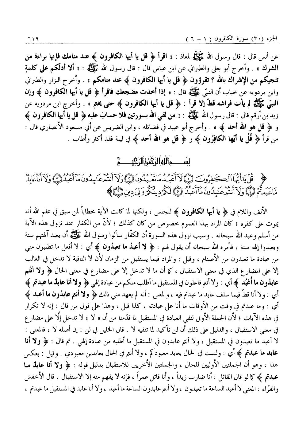 عَنْ أَنَسٍ قَالَ: قَالَ رَسُولُ اللَّهِ صَلَّى الله عليه وسلّم لمعاذ: «اقرأ قُلْ يا أَيُّهَا الْكافِرُونَ عِنْدَ مَنَامِكَ فَإِنَّهَا بَرَاءَةٌ مِنَ الشِّرْكِ» . وَأَخْرَجَ أَبُو يَعْلَى وَالطَّبَرَانِيُّ عَنِ ابْنِ عَبَّاسٍ قَالَ: قَالَ رَسُولُ اللَّهِ صَلَّى اللَّهُ عَلَيْهِ وَسَلَّمَ: «أَلَا أَدُلُّكُمْ عَلَى كَلِمَةٍ تُنْجِيكُمْ مِنَ الإشراك بالله؟ تقرؤون قُلْ يا أَيُّهَا الْكافِرُونَ عِنْدَ مَنَامِكُمْ» . وَأَخْرَجَ الْبَزَّارُ وَالطَّبَرَانِيُّ وَابْنُ مَرْدَوَيْهِ عَنْ خَبَّابٍ أَنَّ النَّبِيَّ صَلَّى اللَّهُ عَلَيْهِ وَسَلَّمَ قَالَ: «إِذَا أَخَذْتَ مَضْجَعَكَ فَاقْرَأْ قُلْ يا أَيُّهَا الْكافِرُونَ وَإِنَّ النَّبِيَّ صَلَّى اللَّهُ عَلَيْهِ وَسَلَّمَ لَمْ يَأْتِ فِرَاشَهُ قَطُّ إِلَّا قَرَأَ: قُلْ يا أَيُّهَا الْكافِرُونَ حَتَّى يَخْتِمَ» . وَأَخْرَجَ ابْنُ مَرْدَوَيْهِ عَنْ زَيْدِ بْنِ أَرْقَمَ قَالَ: قَالَ رَسُولُ اللَّهِ صَلَّى اللَّهُ عَلَيْهِ وَسَلَّمَ: «مَنْ لَقِيَ اللَّهَ بسورتين فلا حساب عليه قُلْ يَا أَيُّهَا الْكافِرُونَ وقُلْ هُوَ اللَّهُ أَحَدٌ» . وَأَخْرَجَ أَبُو عُبَيْدٍ فِي فَضَائِلِهِ، وَابْنُ الضُّرَيْسِ عَنْ أَبِي مَسْعُودٍ الْأَنْصَارِيِّ قَالَ: