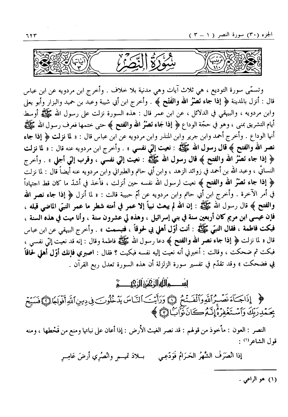 وتسمّى سورة التوديع، هي ثلاث آيات وَهِيَ مَدَنِيَّةٌ بِلَا خِلَافٍ. وَأَخْرَجَ ابْنُ مَرْدَوَيْهِ عَنِ ابْنِ عَبَّاسٍ قَالَ: أُنْزِلَ بِالْمَدِينَةِ إِذا جاءَ نَصْرُ اللَّهِ وَالْفَتْحُ. وَأَخْرَجَ ابْنُ أَبِي شَيْبَةَ وَعَبْدُ بْنُ حُمَيْدٍ وَالْبَزَّارُ وَأَبُو يَعْلَى وَابْنُ مَرْدَوَيْهِ، وَالْبَيْهَقِيُّ فِي الدَّلَائِلِ، عَنِ ابْنِ عُمَرَ قَالَ: هَذِهِ السُّورَةُ نَزَلَتْ عَلَى رَسُولِ اللَّهِ صَلَّى اللَّهُ عَلَيْهِ وَسَلَّمَ أَوْسَطَ أَيَّامِ التَّشْرِيقِ بِمِنًى، وَهُوَ فِي حَجَّةِ الْوَدَاعِ إِذا جاءَ نَصْرُ اللَّهِ وَالْفَتْحُ حَتَّى خَتَمَهَا فَعَرَفَ رسول الله صلى الله عليه وسلم أنها الْوَدَاعُ. وَأَخْرَجَ أَحْمَدُ وَابْنُ جَرِيرٍ وَابْنُ الْمُنْذِرِ وَابْنُ مَرْدَوَيْهِ عَنِ ابْنِ عَبَّاسٍ قَالَ: «لَمَّا نَزَلَتْ إِذا جاءَ نَصْرُ اللَّهِ وَالْفَتْحُ قَالَ رَسُولُ اللَّهِ صَلَّى اللَّهُ عَلَيْهِ وَسَلَّمَ: نُعِيَتْ إِلَيَّ نَفْسِي» . وَأَخْرَجَ ابْنُ مَرْدَوَيْهِ عَنْهُ قَالَ: «لَمَّا نَزَلَتْ إِذا جاءَ نَصْرُ اللَّهِ وَالْفَتْحُ