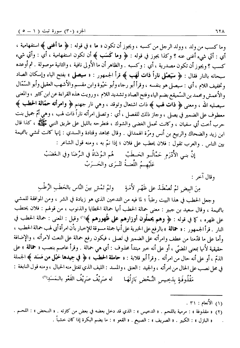 وَمَا كَسَبَ مِنْ وَلَدٍ، وَوَلَدُ الرَّجُلِ مِنْ كَسْبِهِ، وَيَجُوزُ أَنْ تَكُونَ «مَا» فِي قَوْلِهِ: مَا أَغْنى اسْتِفْهَامِيَّةً، أَيْ: أَيُّ شَيْءٍ أَغْنَى عَنْهُ؟ وَكَذَا يَجُوزُ فِي قَوْلِهِ: وَما كَسَبَ أَنْ تَكُونَ اسْتِفْهَامِيَّةً، أَيْ: وَأَيُّ شَيْءٍ كَسَبَ؟ وَيَجُوزُ أَنْ تَكُونَ مَصْدَرِيَّةً، أَيْ: وَكَسْبُهُ. وَالظَّاهِرُ أَنَّ مَا الْأُولَى نَافِيَةٌ، وَالثَّانِيَةَ مَوْصُولَةٌ. ثُمَّ أَوْعَدَهُ سُبْحَانَهُ بِالنَّارِ فَقَالَ: سَيَصْلى نَارًا ذاتَ لَهَبٍ قَرَأَ الْجُمْهُورُ: «سَيَصْلَى» بِفَتْحِ الْيَاءِ وَإِسْكَانِ الصَّادِ وَتَخْفِيفِ اللَّامِ، أَيْ: سَيَصْلَى هُوَ بِنَفْسِهِ، وَقَرَأَ أَبُو رَجَاءٍ وَأَبُو حَيْوَةَ وَابْنُ مِقْسَمٍ والأشهب العقيلي وأبو السّمّال والأعمش ومحمد بن السّميقع بِضَمِّ الْيَاءِ وَفَتْحِ الصَّادِ وَتَشْدِيدِ اللَّامِ، وَرُوِيَتْ هَذِهِ الْقِرَاءَةُ عَنِ ابْنِ كَثِيرٍ، وَالْمَعْنَى سَيُصْلِيهِ اللَّهُ، وَمَعْنَى ذاتَ لَهَبٍ ذَاتَ اشْتِعَالٍ وَتَوَقُّدٍ، وَهِيَ نَارُ جَهَنَّمَ وَامْرَأَتُهُ حَمَّالَةَ الْحَطَبِ مَعْطُوفٌ عَلَى الضَّمِيرِ فِي يَصْلَى، وَجَازَ ذَلِكَ لِلْفَصْلِ، أَيْ: وَتُصْلَى امْرَأَتُهُ نَارًا ذَاتَ لَهَبٍ، وَهِيَ أُمُّ جَمِيلٍ بِنْتُ حَرْبٍ أُخْتُ أَبِي سُفْيَانَ، وَكَانَتْ تَحْمِلُ الْغَضَى وَالشَّوْكَ، فَتَطْرَحُهُ بِاللَّيْلِ عَلَى طَرِيقِ النَّبِيِّ صَلَّى اللَّهُ عَلَيْهِ وَسَلَّمَ، كَذَا قَالَ ابْنُ زَيْدٍ وَالضَّحَّاكُ وَالرَّبِيعُ بْنُ أَنَسٍ وَمُرَّةُ الْهَمْدَانِيُّ. وَقَالَ مُجَاهِدٌ وَقَتَادَةُ وَالسُّدِّيُّ: إِنَّهَا كَانَتْ تَمْشِي بِالنَّمِيمَةِ بَيْنَ النَّاسِ. وَالْعَرَبُ تَقُولُ: فُلَانٌ يَحْطِبُ عَلَى فُلَانٍ إِذَا نَمَّ بِهِ، وَمِنْهُ قَوْلُ الشَّاعِرِ: