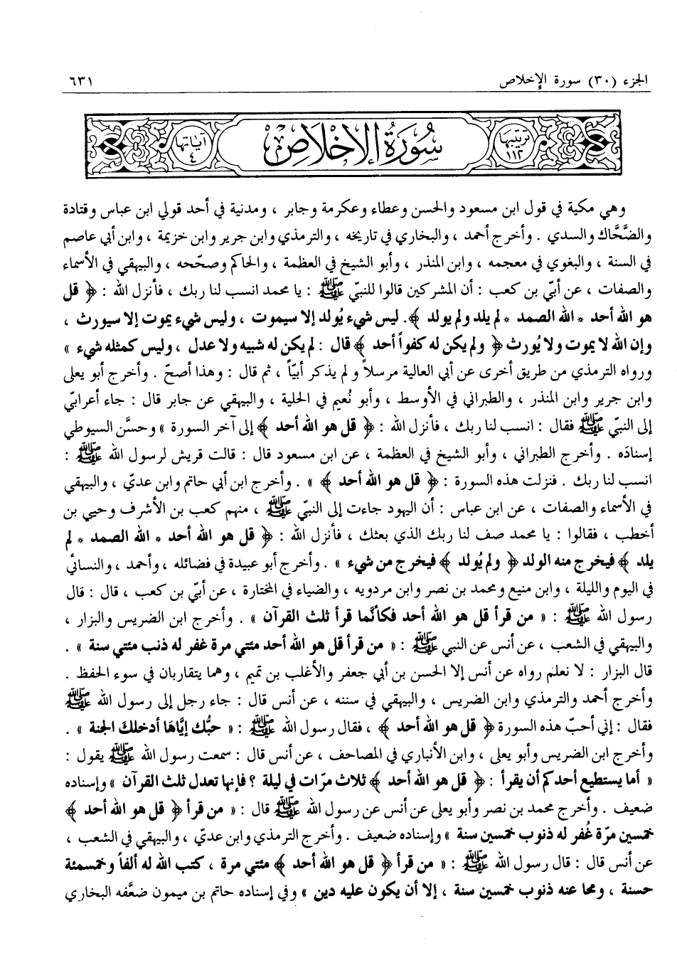«أَمَا يَسْتَطِيعُ أَحَدُكُمْ أَنْ يَقْرَأَ: قُلْ هُوَ اللَّهُ أَحَدٌ ثَلَاثَ مَرَّاتٍ فِي لَيْلَةٍ؟ فَإِنَّهَا تَعْدِلُ ثُلُثَ الْقُرْآنِ» وَإِسْنَادُهُ ضَعِيفٌ. وَأَخْرَجَ مُحَمَّدُ بْنُ نَصْرٍ وَأَبُو يَعْلَى عَنْ أَنَسٍ عَنْ رَسُولِ اللَّهِ صَلَّى اللَّهُ عَلَيْهِ وَسَلَّمَ قال: «مَنْ قَرَأَ قُلْ هُوَ اللَّهُ أَحَدٌ خَمْسِينَ مَرَّةً غُفِرَ لَهُ ذُنُوبُ خَمْسِينَ سَنَةً» وَإِسْنَادُهُ ضَعِيفٌ. وَأَخْرَجَ التِّرْمِذِيُّ وَابْنُ عَدِيٍّ، وَالْبَيْهَقِيُّ فِي الشُّعَبِ، عَنْ أَنَسٍ قَالَ: قَالَ رَسُولُ اللَّهِ صَلَّى اللَّهُ عَلَيْهِ وَسَلَّمَ: «مِنِ قَرَأَ قُلْ هُوَ اللَّهُ أَحَدٌ مِائَتَيْ مَرَّةٍ، كَتَبَ اللَّهُ لَهُ أَلْفًا وَخَمْسَمِائَةِ حَسَنَةٍ، وَمَحَا عَنْهُ ذُنُوبَ خَمْسِينَ سَنَةً، إِلَّا أَنْ يَكُونَ عَلَيْهِ دَيْنٌ» وَفِي إِسْنَادِهِ حَاتِمُ بْنُ مَيْمُونٍ ضَعَّفَهُ الْبُخَارِيُّ