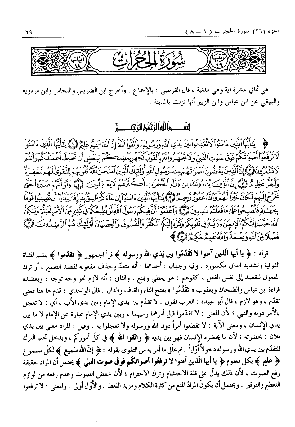 يَا أَيُّهَا الَّذِينَ آمَنُوا لَا تُقَدِّمُوا بَيْنَ يَدَيِ اللَّهِ وَرَسُولِهِ وَاتَّقُوا اللَّهَ إِنَّ اللَّهَ سَمِيعٌ عَلِيمٌ (1) يَا أَيُّهَا الَّذِينَ آمَنُوا لَا تَرْفَعُوا أَصْواتَكُمْ فَوْقَ صَوْتِ النَّبِيِّ وَلا تَجْهَرُوا لَهُ بِالْقَوْلِ كَجَهْرِ بَعْضِكُمْ لِبَعْضٍ أَنْ تَحْبَطَ أَعْمالُكُمْ وَأَنْتُمْ لَا تَشْعُرُونَ (2) إِنَّ الَّذِينَ يَغُضُّونَ أَصْواتَهُمْ عِنْدَ رَسُولِ اللَّهِ أُولئِكَ الَّذِينَ امْتَحَنَ اللَّهُ قُلُوبَهُمْ لِلتَّقْوى لَهُمْ مَغْفِرَةٌ وَأَجْرٌ عَظِيمٌ (3) إِنَّ الَّذِينَ يُنادُونَكَ مِنْ وَراءِ الْحُجُراتِ أَكْثَرُهُمْ لَا يَعْقِلُونَ (4)