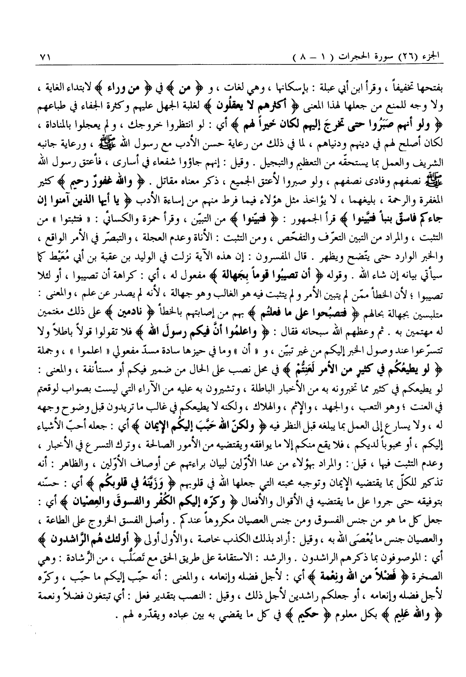 جَعَلَ كُلَّ مَا هُوَ مِنْ جِنْسِ الْفُسُوقِ وَمِنْ جِنْسِ الْعِصْيَانِ مَكْرُوهًا عِنْدَكُمْ. وَأَصْلُ الْفِسْقِ الخروج على الطَّاعَةِ، وَالْعِصْيَانُ جِنْسُ مَا يُعْصَى اللَّهُ بِهِ، وَقِيلَ: أَرَادَ بِذَلِكَ الْكَذِبَ خَاصَّةً، وَالْأَوَّلُ أَوْلَى أُولئِكَ هُمُ الرَّاشِدُونَ أَيِ: الْمَوْصُوفُونَ بِمَا ذَكَرَهُمُ الرَّاشِدُونَ. وَالرُّشْدُ: الِاسْتِقَامَةُ عَلَى طَرِيقِ الْحَقِّ مَعَ تَصَلُّبٍ، مِنَ الرَّشَادَةِ: وَهِيَ الصَّخْرَةُ فَضْلًا مِنَ اللَّهِ وَنِعْمَةً أَيْ: لِأَجْلِ فَضْلِهِ وَإِنْعَامِهِ، وَالْمَعْنَى: أنه حبّب إليكم ما حبّب، وكرّه لِأَجْلِ فَضْلِهِ وَإِنْعَامِهِ، أَوْ جَعَلَكُمْ رَاشِدِينَ لِأَجْلِ ذَلِكَ، وَقِيلَ: النَّصْبُ بِتَقْدِيرِ فِعْلٍ: أَيْ تَبْتَغُونَ فَضْلًا وَنِعْمَةً وَاللَّهُ عَلِيمٌ بِكُلِّ مَعْلُومٍ حَكِيمٌ فِي كُلِّ مَا يَقْضِي بِهِ بَيْنَ عِبَادِهِ ويقدّره لهم.