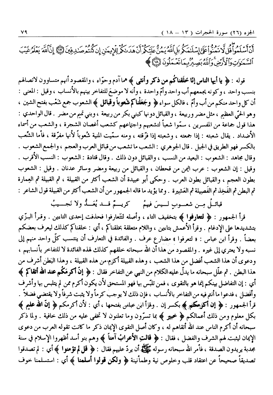 أَنَّ كُلَّ وَاحِدٍ مِنْكُمْ مِنْ أَبٍ وَأُمٍّ، فَالْكُلُّ سَوَاءٌ وَجَعَلْناكُمْ شُعُوباً وَقَبائِلَ الشُّعُوبُ جَمْعُ شَعْبٍ بِفَتْحِ الشِّينِ، وَهُوَ الْحَيُّ الْعَظِيمُ، مِثْلُ مُضَرَ وَرَبِيعَةَ، وَالْقَبَائِلُ دُونَهَا كَبَنِي بَكْرٍ مِنْ رَبِيعَةَ، وَبَنِي تَمِيمٍ مِنْ مُضَرَ. قَالَ الْوَاحِدِيُّ: