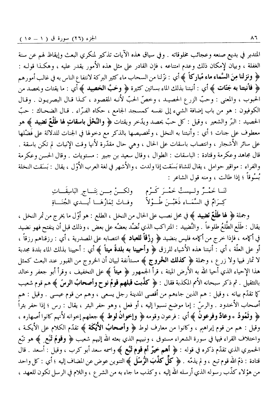 وَنَزَّلْنا مِنَ السَّماءِ مَاءً مُبارَكاً أَيْ: نَزَّلْنَا مِنَ السَّحَابِ مَاءً كَثِيرَ الْبَرَكَةِ لِانْتِفَاعِ النَّاسِ بِهِ فِي غَالِبِ أُمُورِهِمْ فَأَنْبَتْنا بِهِ جَنَّاتٍ أَيْ: أَنْبَتْنَا بِذَلِكَ الْمَاءِ بَسَاتِينَ كَثِيرَةً وَحَبَّ الْحَصِيدِ أَيْ: مَا يُقْتَاتُ وَيُحْصَدُ مِنَ الْحُبُوبِ، وَالْمَعْنَى: وَحَبَّ الزَّرْعِ الْحَصِيدِ، وَخُصَّ الْحَبُّ لِأَنَّهُ الْمَقْصُودُ، كَذَا قَالَ الْبَصْرِيُّونَ. وَقَالَ الْكُوفِيُّونَ: هُوَ مِنْ بَابِ إِضَافَةِ الشَّيْءِ إِلَى نَفْسِهِ كَمَسْجِدِ الْجَامِعِ، حَكَاهُ الْفَرَّاءُ. قَالَ الضَّحَّاكُ: حَبُّ الْحَصِيدِ: الْبُرُّ وَالشَّعِيرُ، وَقِيلَ: كُلُّ حَبٍّ يُحْصَدُ وَيُدَّخَرُ وَيُقْتَاتُ وَالنَّخْلَ باسِقاتٍ لَها طَلْعٌ نَضِيدٌ هُوَ مَعْطُوفٌ عَلَى جَنَّاتٍ أَيْ: وَأَنْبَتْنَا بِهِ النَّخْلَ، وَتَخْصِيصُهَا بِالذِّكْرِ مَعَ دُخُولِهَا فِي الْجَنَّاتِ لِلدَّلَالَةِ عَلَى فَضْلِهَا عَلَى سَائِرِ الْأَشْجَارِ، وَانْتِصَابُ بَاسِقَاتٍ عَلَى الْحَالِ، وَهِيَ حَالٌ مُقَدَّرَةٌ لِأَنَّهَا وَقْتَ الْإِنْبَاتِ لَمْ تَكُنْ بَاسِقَةً.