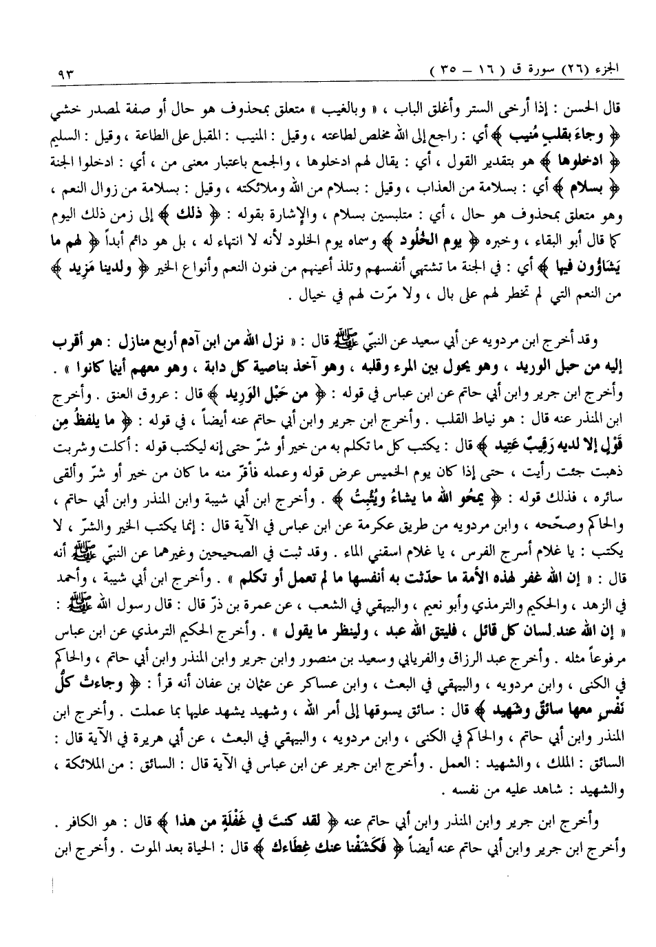 وَأَخْرَجَ ابْنُ جَرِيرٍ وَابْنُ أَبِي حَاتِمٍ عَنِ ابْنِ عَبَّاسٍ فِي قَوْلِهِ: مِنْ حَبْلِ الْوَرِيدِ قَالَ: عُرُوقُ الْعُنُقِ. وَأَخْرَجَ ابْنُ الْمُنْذِرِ عَنْهُ قَالَ: هُوَ نِيَاطُ الْقَلْبِ. وَأَخْرَجَ ابْنُ جَرِيرٍ وَابْنُ أَبِي حَاتِمٍ عَنْهُ أَيْضًا، فِي قَوْلِهِ: مَا يَلْفِظُ مِنْ قَوْلٍ إِلَّا لَدَيْهِ رَقِيبٌ عَتِيدٌ قَالَ: يَكْتُبُ كُلَّ مَا تَكَلَّمَ بِهِ مِنْ خَيْرٍ أَوْ شَرٍّ حَتَّى إِنَّهُ لَيَكْتُبُ قَوْلَهُ: أَكَلْتُ وَشَرِبْتُ ذَهَبْتُ جِئْتُ رَأَيْتُ، حَتَّى إِذَا كَانَ يَوْمُ الْخَمِيسِ عَرَضَ قَوْلَهُ وَعَمَلَهُ فَأَقَرَّ مِنْهُ مَا كَانَ مِنْ خَيْرٍ أَوْ شَرٍّ وَأَلْقَى سَائِرَهُ، فَذَلِكَ قَوْلُهُ: يَمْحُوا اللَّهُ ما يَشاءُ وَيُثْبِتُ. وَأَخْرَجَ ابْنُ أَبِي شَيْبَةَ وَابْنُ الْمُنْذِرِ وَابْنُ أَبِي حَاتِمٍ، وَالْحَاكِمُ وَصَحَّحَهُ، وَابْنُ مَرْدَوَيْهِ مِنْ طَرِيقِ عِكْرِمَةَ عَنِ ابْنِ عَبَّاسٍ فِي الْآيَةِ قَالَ: إِنَّمَا يُكْتَبُ الْخَيْرُ وَالشَّرُّ، لَا يُكْتَبُ: يَا غُلَامُ اسْرُجِ الْفَرَسَ، يَا غُلَامُ اسْقِنِي الماء. وقد ثبت في الصحيحين وغير هما عَنِ النَّبِيِّ صَلَّى اللَّهُ عَلَيْهِ وَسَلَّمَ أَنَّهُ قَالَ: «إِنَّ اللَّهَ غَفَرَ لِهَذِهِ الْأُمَّةِ مَا حَدَّثَتْ بِهِ أَنْفُسَهَا مَا لَمْ تَعْمَلْ أَوْ تَكَلَّمْ» . وَأَخْرَجَ ابْنُ أَبِي شَيْبَةَ، وَأَحْمَدُ فِي الزُّهْدِ، والحكيم والترمذي وأبو نعيم، والبيهقي في الشعب، عن عمرة بْنِ ذَرٍّ قَالَ: قَالَ رَسُولُ اللَّهِ صَلَّى اللَّهُ عَلَيْهِ وَسَلَّمَ: