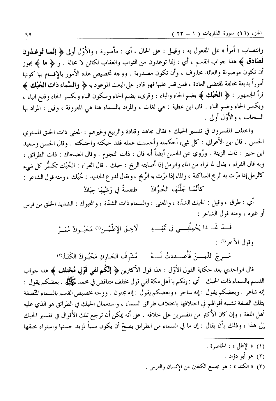 وَاخْتَلَفَ الْمُفَسِّرُونَ فِي تَفْسِيرِ الْحُبُكِ فَقَالَ مُجَاهِدٌ وَقَتَادَةُ وَالرَّبِيعُ وَغَيْرُهُمْ: الْمَعْنَى ذَاتُ الْخَلْقِ الْمُسْتَوِي الْحَسَنِ. قَالَ ابْنُ الْأَعْرَابِيِّ: كُلُّ شَيْءٍ أَحْكَمْتَهُ وَأَحْسَنْتَ عَمَلَهُ فقد حبكته واحتبكته. وقال الحسن وسعيد ابن جُبَيْرٍ: ذَاتُ الزِّينَةِ. وَرُوِيَ عَنِ الْحَسَنِ أَيْضًا أَنَّهُ قَالَ: ذَاتُ النُّجُومِ. وَقَالَ الضَّحَّاكُ: ذَاتُ الطَّرَائِقِ، وَبِهِ قَالَ الْفَرَّاءُ، يُقَالُ لِمَا تَرَاهُ مِنَ الْمَاءِ وَالرَّمْلِ إِذَا أَصَابَتْهُ الرِّيحُ: حُبُكٌ. قال الفراء: الحبك تكسّر كُلُّ شَيْءٍ كَالرَّمْلِ إِذَا مَرَّتْ بِهِ الرِّيحُ السَّاكِنَةُ، وَالْمَاءُ إِذَا مَرَّتْ بِهِ الرِّيحُ، وَيُقَالُ لِدِرْعِ الْحَدِيدِ: حُبُكٌ، وَمِنْهُ قَوْلُ الشَّاعِرِ: