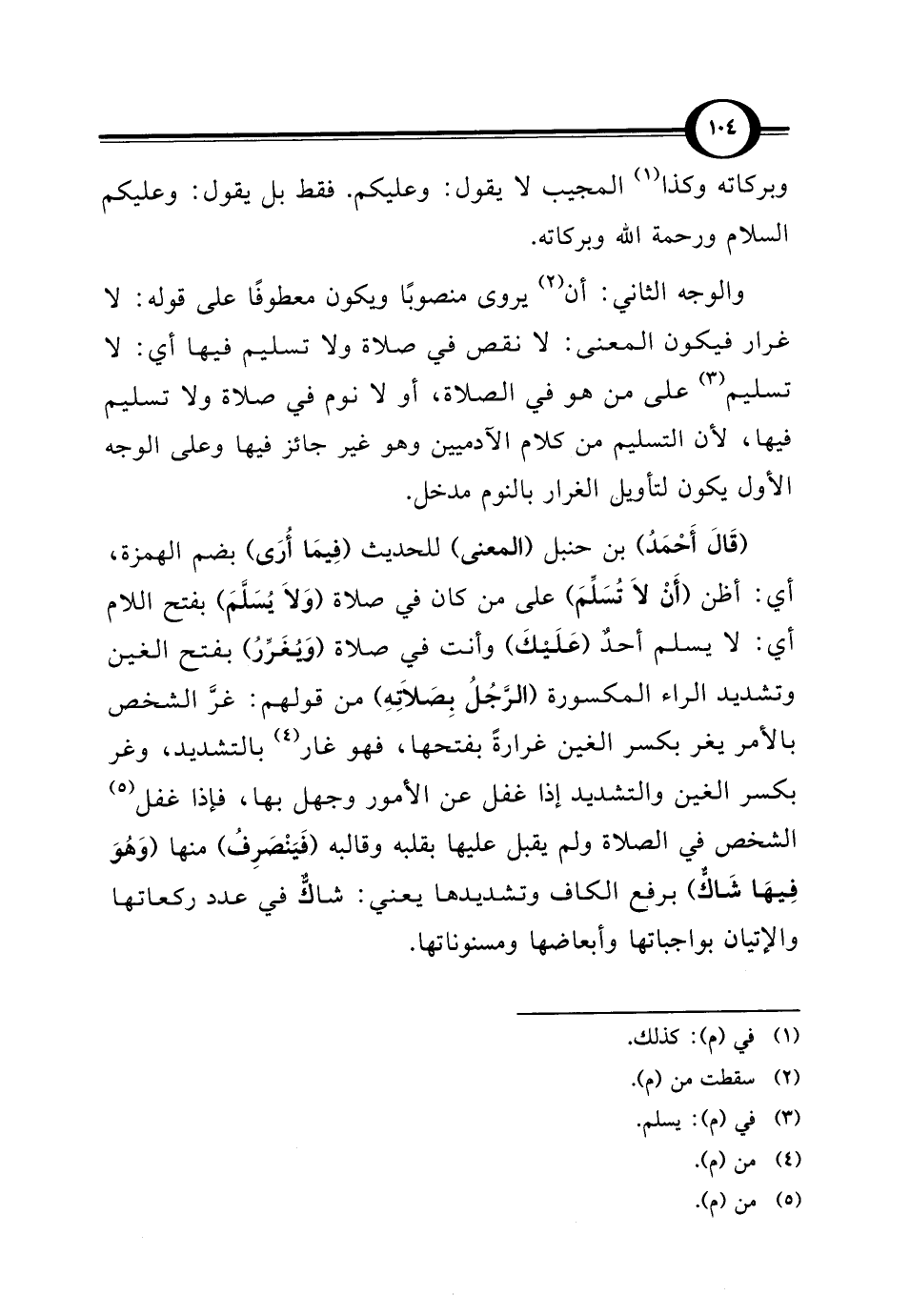 (قَال أَحْمَدُ) بن حنبل (المعنى) للحديث (فِيمَا أُرَى) بضم الهمزة، أي: أظن (أَنْ لَا تُسَلِّمَ) على من كان في صلاة (وَلَا يُسَلَّمَ) بفتح اللام أي: لا يسلم أحدٌ (عَلَيكَ) وأنت في صلاة (وَيُغَرِّرُ) بفتح الغين وتشديد الراء المكسورة (الرَّجُلُ بِصَلاِتهِ) من قولهم: غرَّ الشخص بالأمر يغر بكسر الغين غرارةً بفتحها، فهو غار (¬4) بالتشديد، وغر بكسر الغين والتشديد إذا غفل عن الأمور وجهل بها، فإذا غفل (¬5) الشخص في الصلاة ولم يقبل عليها بقلبه وقالبه (فَيَنْصَرِفُ) منها (وَهُوَ فِيهَا شَاكٌّ) برفغ الكاف وتشديدها يعني: شاكٌّ في عدد ركعاتها والإتيان بواجباتها وأبعاضها ومسنوناتها.