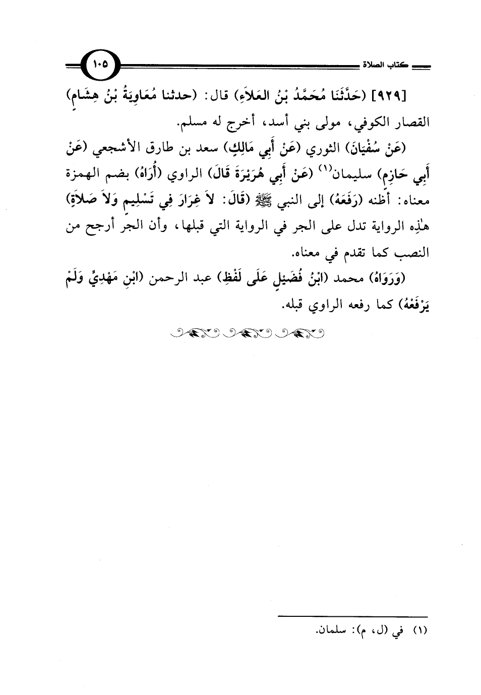 (عَنْ سُفْيَانَ) الثوري (عَنْ أَبِي مَالِكٍ) سعد بن طارق الأشجعي (عَنْ أَبِي حَازِمٍ) سليمان (¬1) (عَنْ أَبِي هُرَيْرَةَ قَال) الراوي (أُرَاهُ) بضم الهمزة معناه: أظنه (رَفَعَهُ) إلى النبي - صلى الله عليه وسلم - (قَال: لَا غِرَارَ فِي تَسْلِيمٍ وَلَا صَلَاةٍ) هذِه الرواية تدل على الجر في الرواية التي قبلها، وأن الجر أرجح من النصب كما تقدم في معناه.