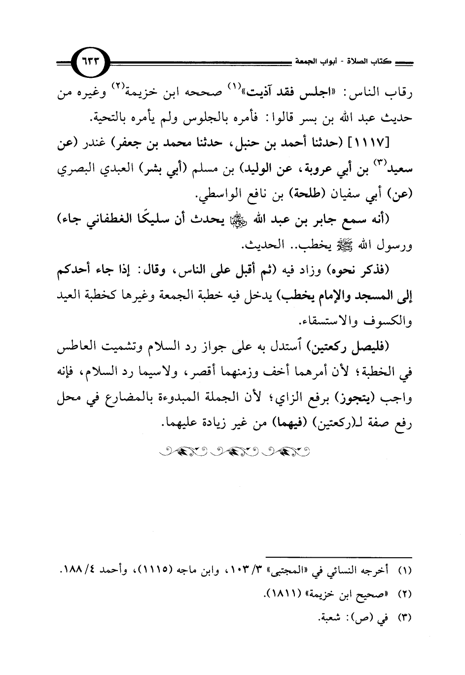 رقاب الناس: "اجلس فقد آذيت" (¬1) صححه ابن خزيمة (¬2) وغيره من حديث عبد الله بن بسر قالوا: فأمره بالجلوس ولم يأمره بالتحية.