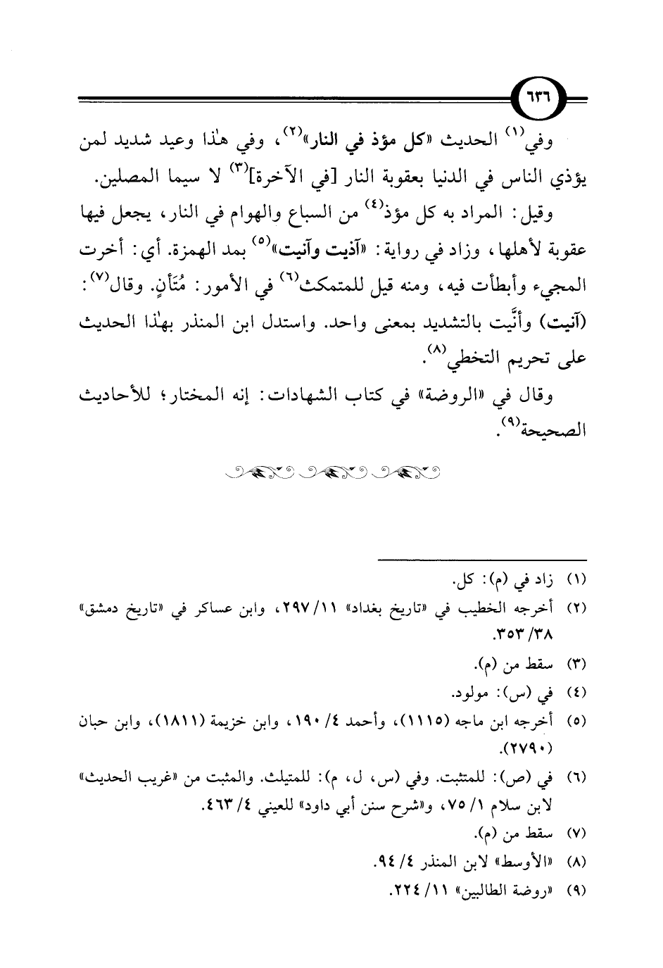 وقيل: المراد به كل مؤذ (¬4) من السباع والهوام في النار، يجعل فيها عقوبة لأهلها، وزاد في رواية: "آذيت وآنيت" (¬5) بمد الهمزة. أي: أخرت المجيء وأبطأت فيه، ومنه قيل للمتمكث (¬6) في الأمور: مُتَأنٍ. وقال (¬7): (آنيت) وأنَّيت بالتشديد بمعنى واحد. واستدل ابن المنذر بهذا الحديث على تحريم التخطي (¬8).