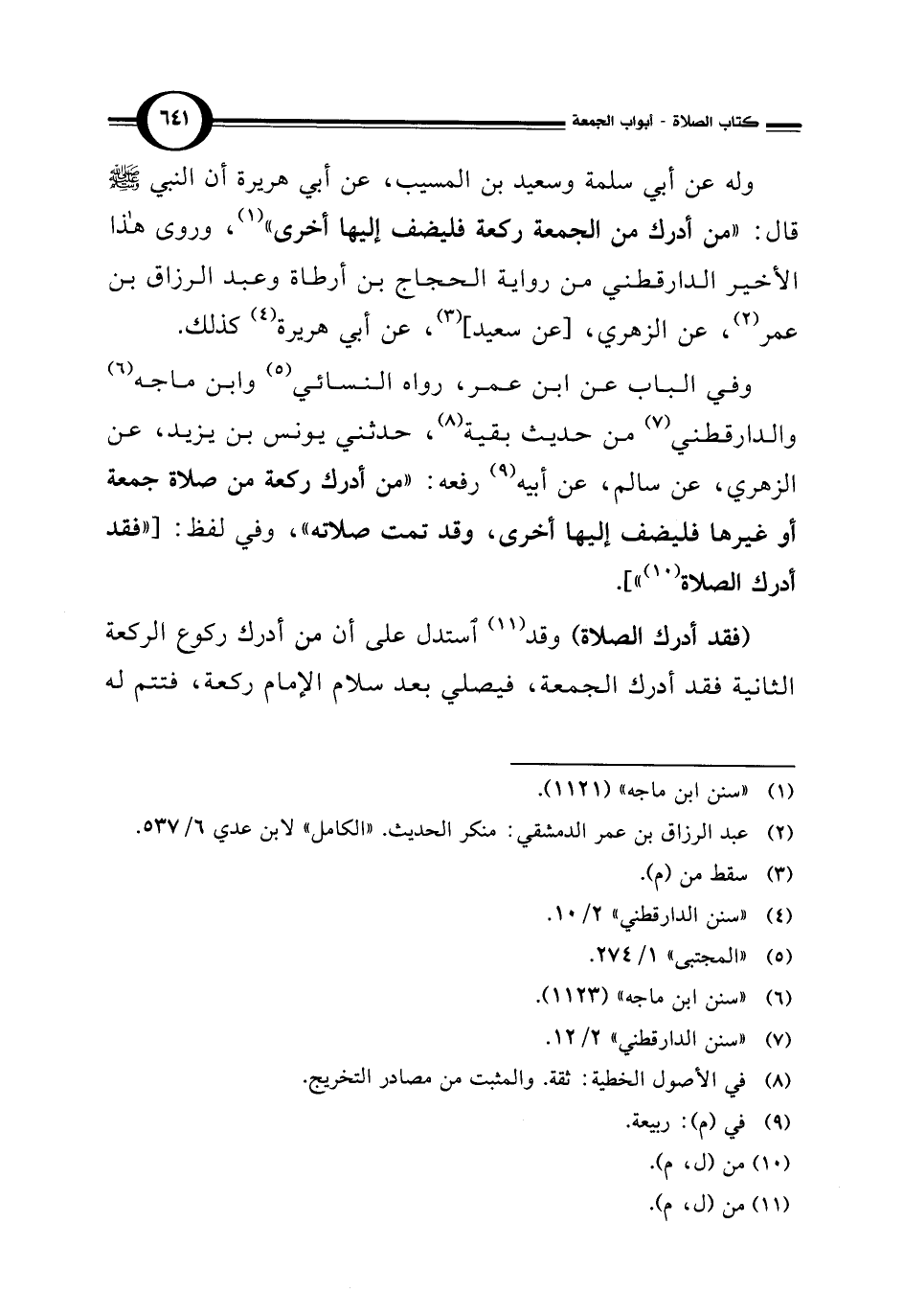 وله عن أبي سلمة وسعيد بن المسيب، عن أبي هريرة أن النبي - صلى الله عليه وسلم - قال: "من أدرك من الجمعة ركعة فليضف إليها أخرى" (¬1)، وروى هذا الأخير الدارقطني من رواية الحجاج بن أرطاة وعبد الرزاق بن عمر (¬2)، عن الزهري، [عن سعيد] (¬3)، عن أبي هريرة (¬4) كذلك.