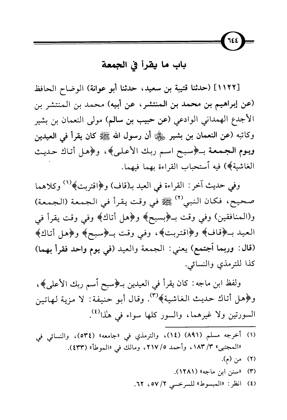 [1122] (حدثنا قتيبة بن سعيد، حدثنا أبو عوانة) الوضاح الحافظ (عن إبراهيم بن محمد بن المنتشر، عن أبيه) محمد بن المنتشر بن الأجدع الهمداني الوادعي (عن حبيب بن سالم) مولى النعمان بن بشير وكاتبه (عن النعمان بن بشير - رضي الله عنهما - أن رسول الله - صلى الله عليه وسلم - كان يقرأ في العيدين ويوم الجمعة بـ {سَبِّحِ اسْمَ رَبِّكَ الْأَعْلَى}، و {هَلْ أَتَاكَ حَدِيثُ الْغَاشِيَةِ}) فيه استحباب القراءة بهما فيهما.