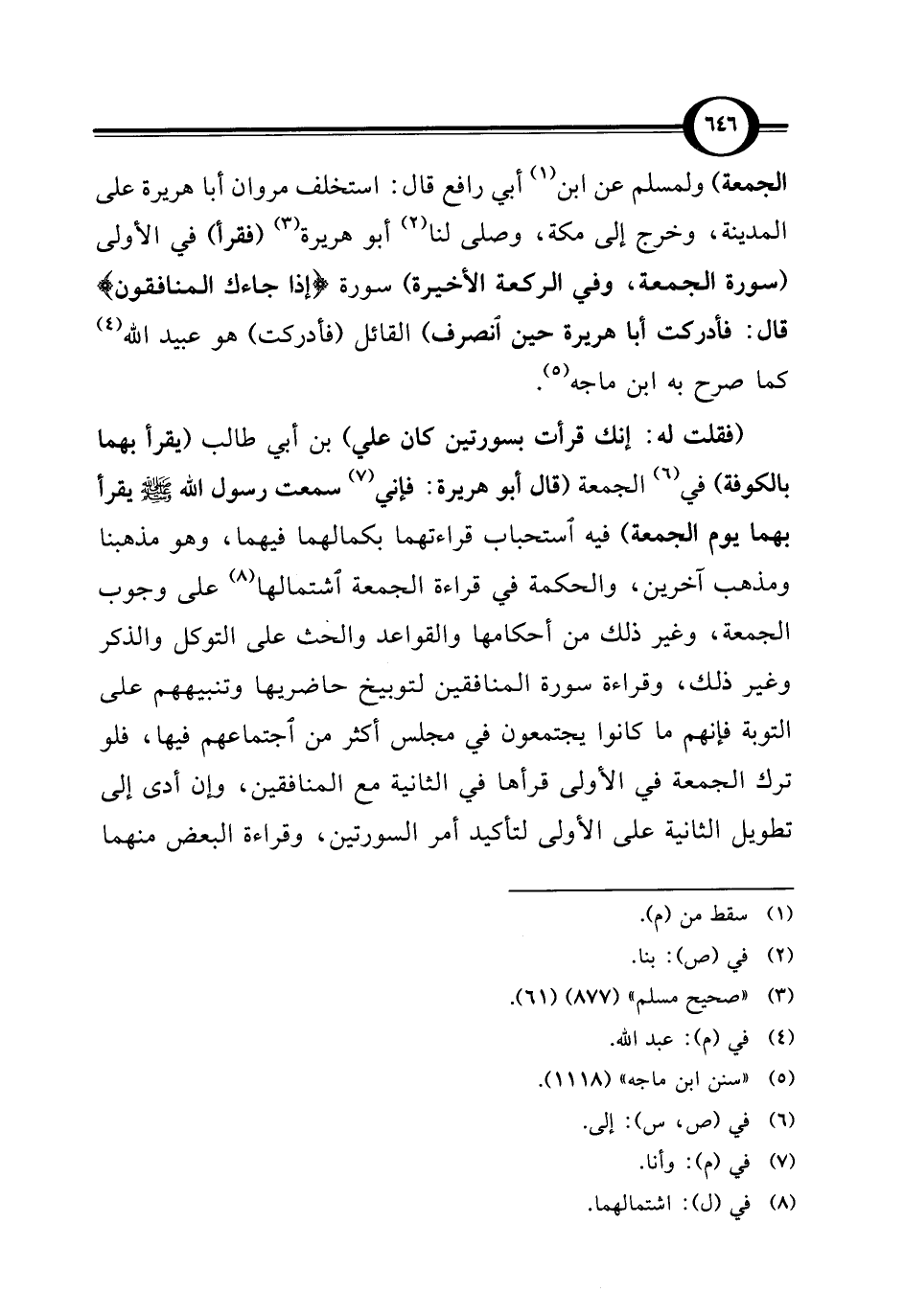 الجمعة) ولمسلم عن ابن (¬1) أبي رافع قال: استخلف مروان أبا هريرة على المدينة، وخرج إلى مكة، وصلى لنا (¬2) أبو هريرة (¬3) (فقرأ) في الأولى (سورة الجمعة، وفي الركعة الأخيرة) سورة {إِذَا جَاءَكَ الْمُنَافِقُونَ} قال: فأدركت أبا هريرة حين انصرف) القائل (فأدركت) هو عبيد الله (¬4) كما صرح به ابن ماجه (¬5).