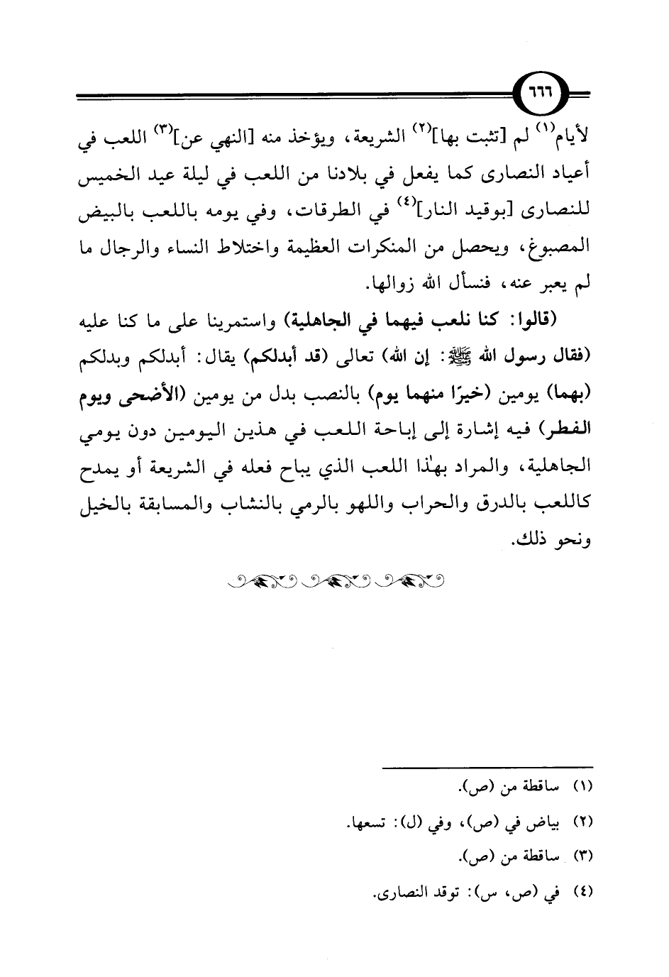 لأيام (¬1) لم [تثبت بها] (¬2) الشريعة، ويؤخذ منه [النهي عن] (¬3) اللعب في أعياد النصارى كما يفعل في بلادنا من اللعب في ليلة عيد الخميس للنصارى [بوقيد النار] (¬4) في الطرقات، وفي يومه باللعب بالبيض المصبوغ، ويحصل من المنكرات العظيمة واختلاط النساء والرجال ما لم يعبر عنه، فنسأل الله زوالها.