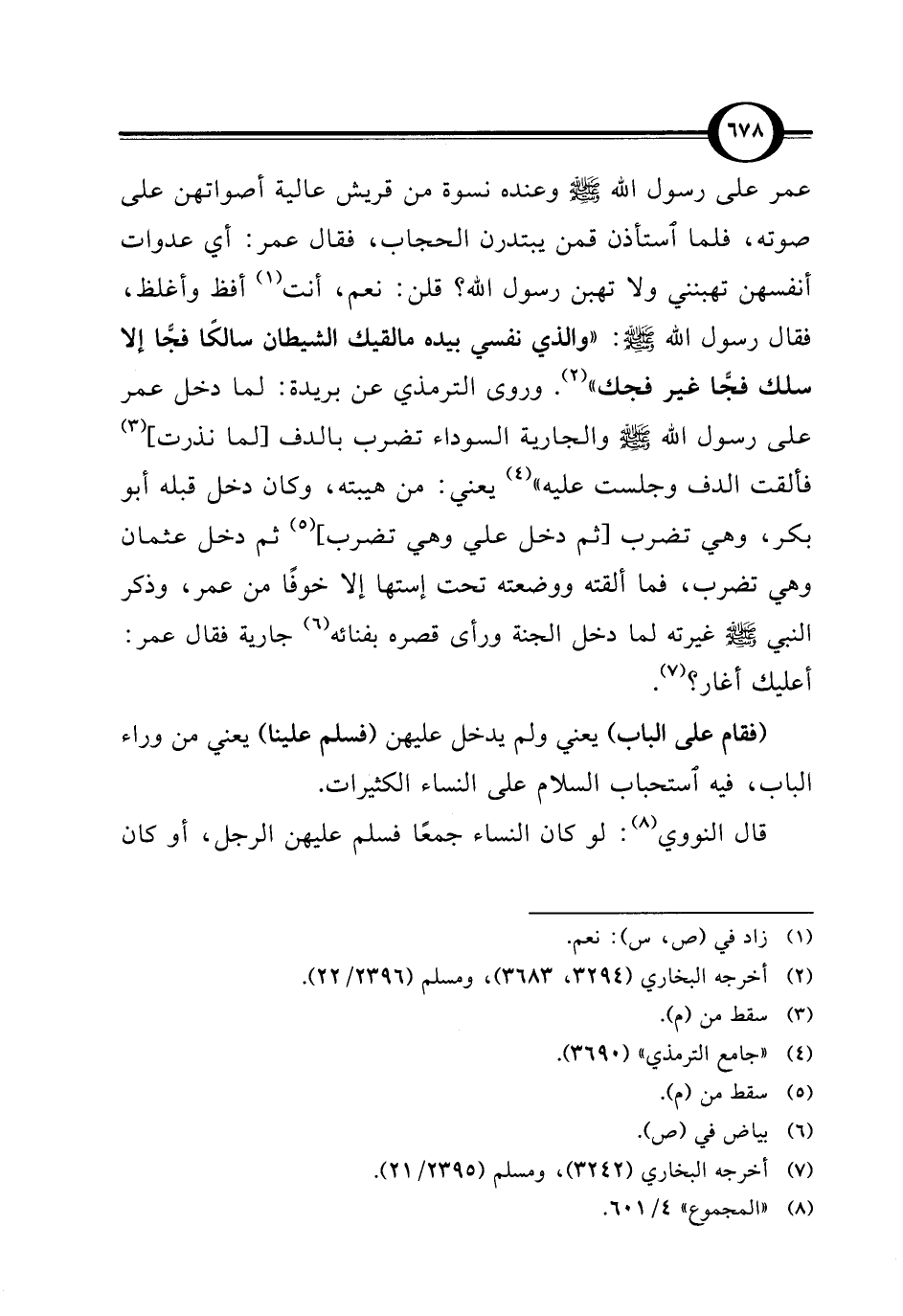 عمر على رسول الله - صلى الله عليه وسلم - وعنده نسوة من قريش عالية أصواتهن على صوته، فلما استأذن قمن يبتدرن الحجاب، فقال عمر: أي عدوات أنفسهن تهبنني ولا تهبن رسول الله؟ قلن: نعم، أنت (¬1) أفظ وأغلظ، فقال رسول الله - صلى الله عليه وسلم -: "والذي نفسي بيده ما لقيك الشيطان سالكًا فجًّا إلا سلك فجًّا غير فجك" (¬2). وروى الترمذي عن بريدة: لما دخل عمر على رسول الله - صلى الله عليه وسلم - والجارية السوداء تضرب بالدف [لما نذرت] (¬3) فألقت الدف وجلست عليه" (¬4) يعني: من هيبته، وكان دخل قبله أبو بكر، وهي تضرب [ثم دخل علي وهي تضرب] (¬5) ثم دخل عثمان وهي تضرب، فما ألقته ووضعته تحت إستها إلا خوفًا من عمر، وذكر النبي - صلى الله عليه وسلم - غيرته لما دخل الجنة ورأى قصره بفنائه (¬6) جارية فقال عمر: أعليك أغار؟ (¬7).