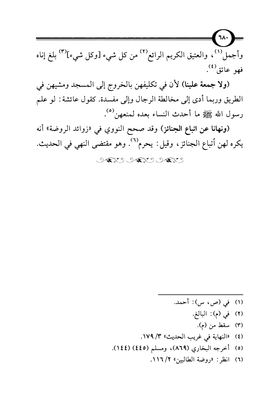(ونهانا عن اتباع الجنائز) وقد صحح النووي في "زوائد الروضة" أنه يكره لهن اتباع الجنائز، وقيل: يحرم (¬6). وهو مقتضى النهي في الحديث.