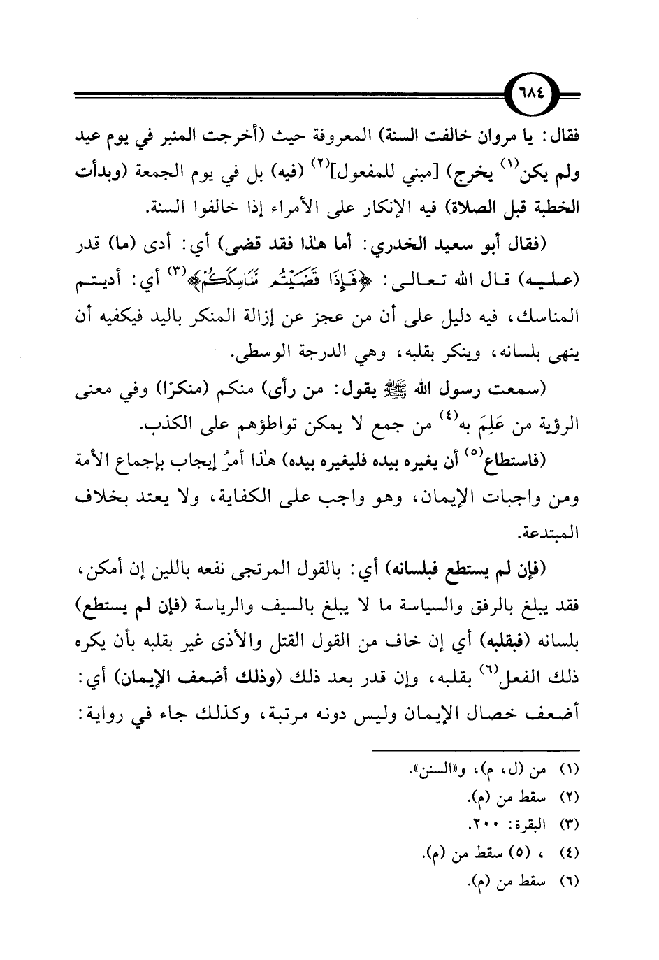 (فإن لم يستطع فبلسانه) أي: بالقول المرتجى نفعه باللين إن أمكن، فقد يبلغ بالرفق والسياسة ما لا يبلغ بالسيف والرياسة (فإن لم يستطع) بلسانه (فبقلبه) أي إن خاف من القول القتل والأذى غير بقلبه بأن يكره ذلك الفعل (¬6) بقلبه، وإن قدر بعد ذلك (وذلك أضعف الإيمان) أي: أضعف خصال الإيمان وليس دونه مرتبة، وكذلك جاء في رواية: