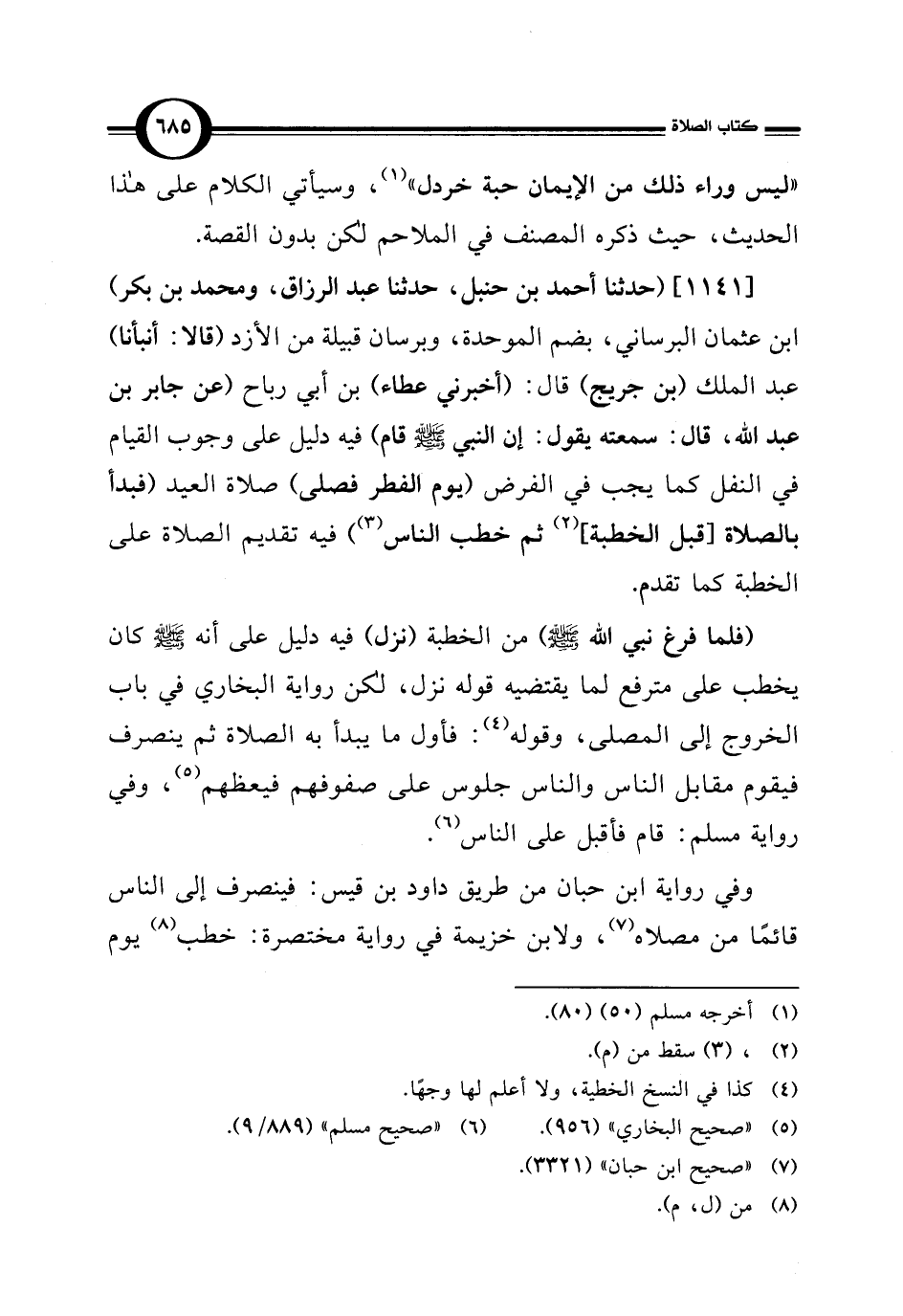 [1141] (حدثنا أحمد بن حنبل، حدثنا عبد الرزاق، ومحمد بن بكر) ابن عثمان البرساني، بضم الموحدة، وبرسان قبيلة من الأزد (قالا: أنبأنا) عبد الملك (بن جريج) قال: (أخبرني عطاء) بن أبي رباح (عن جابر بن عبد الله، قال: سمعته يقول: إن النبي - صلى الله عليه وسلم - قام) فيه دليل على وجوب القيام في النفل كما يجب في الفرض (يوم الفطر فصلى) صلاة العيد (فبدأ بالصلاة [قبل الخطبة] (¬2) ثم خطب الناس) (¬3) فيه تقديم الصلاة على الخطبة كما تقدم.