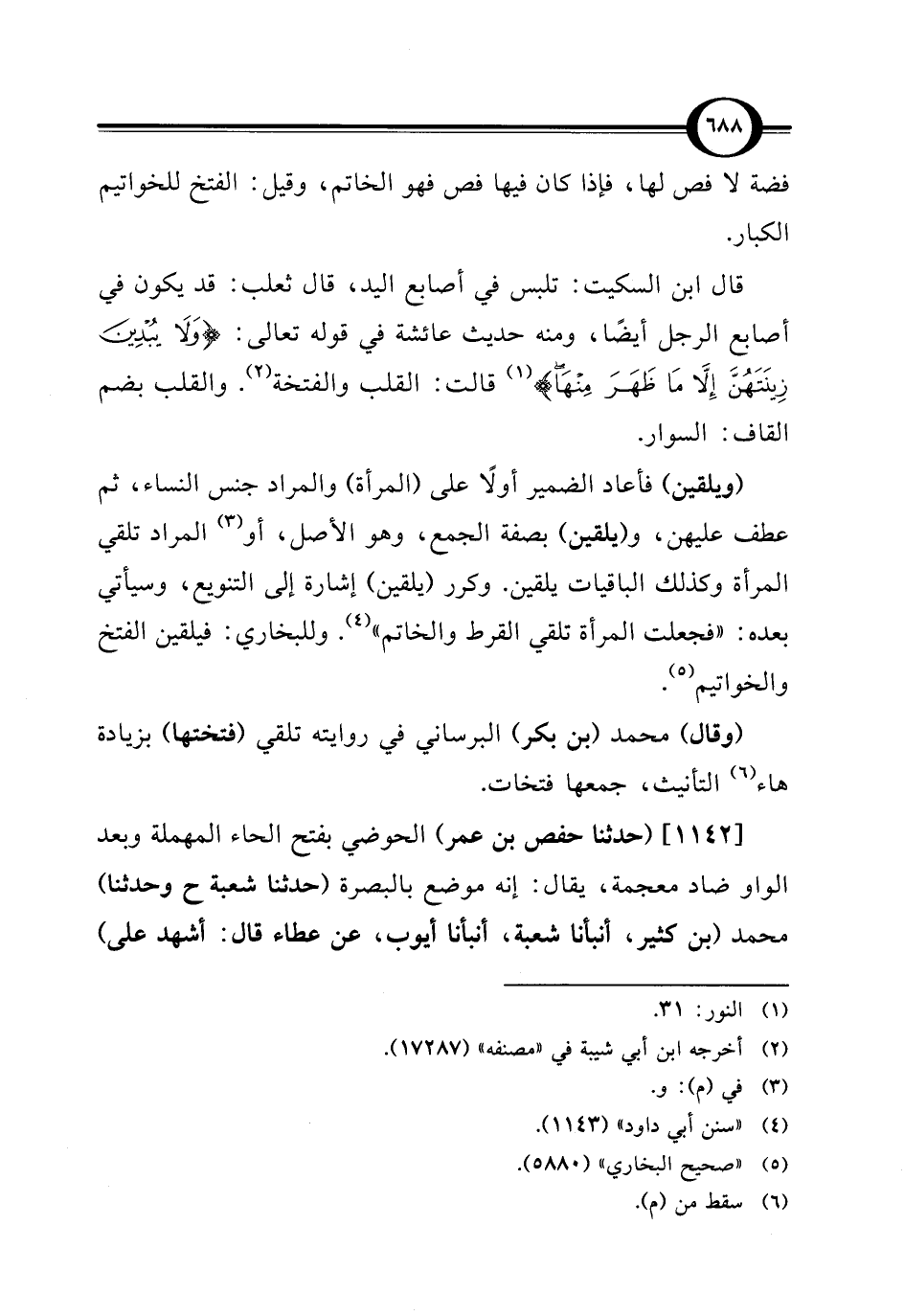 (وقال) محمد (بن بكر) البرساني في روايته تلقي (فتختها) بزيادة هاء (¬6) التأنيث، جمعها فتخات.