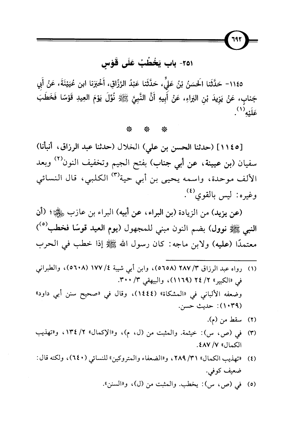 1145 - حَدَّثَنا الحَسَنُ بْنُ عَلِيٍّ، حَدَّثَنا عبد الرَّزَّاقِ، أَخْبَرَنا ابن عُيَيْنَةَ، عَنْ أَبِي جَنابٍ، عَنْ يَزِيدَ بْنِ البَراءِ، عَنْ أَبِيهِ أَنَّ النَّبِيَّ - صلى الله عليه وسلم - نُوِّلَ يَوْمَ العِيدِ قَوْسًا فَخَطَبَ عَلَيْهِ (¬1).