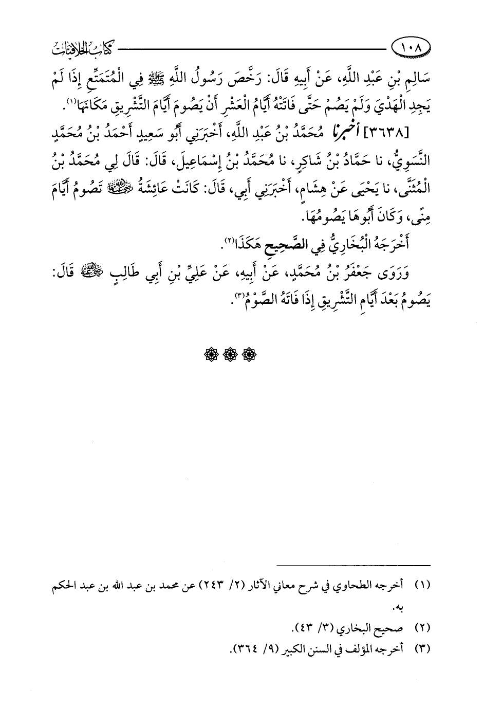 سَالِمِ بْنِ عَبْدِ اللَّهِ، عَنْ أَبِيهِ قَالَ: رَخَّصَ رَسُولُ اللَّهِ - صلى الله عليه وسلم - فِي الْمُتَمَتِّعِ إِذَا لَمْ يَجِدِ الْهَدْيَ وَلَم يَصُمْ حَتَّى فَاتَتْهُ أَيَّامُ الْعَشْرِ أَنْ يَصُومَ أَيَّامَ التَّشْرِيقِ مَكَانَهَا (¬1).